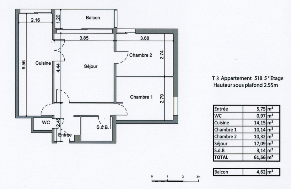 Appartement T3 d'environ 62 m2 situé au 5 ème étage au sein d'une résidence sécurisée.