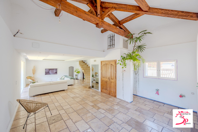 L'entrée ouvre sur une vaste pièce de vie aux volumes généreux où s'articulent l'espace cuisine avec ferme apparente et le salon.