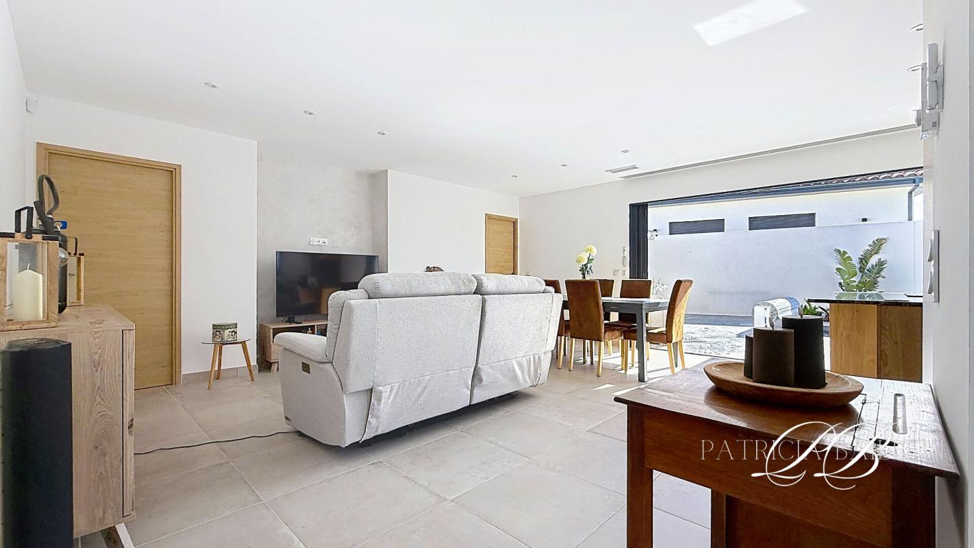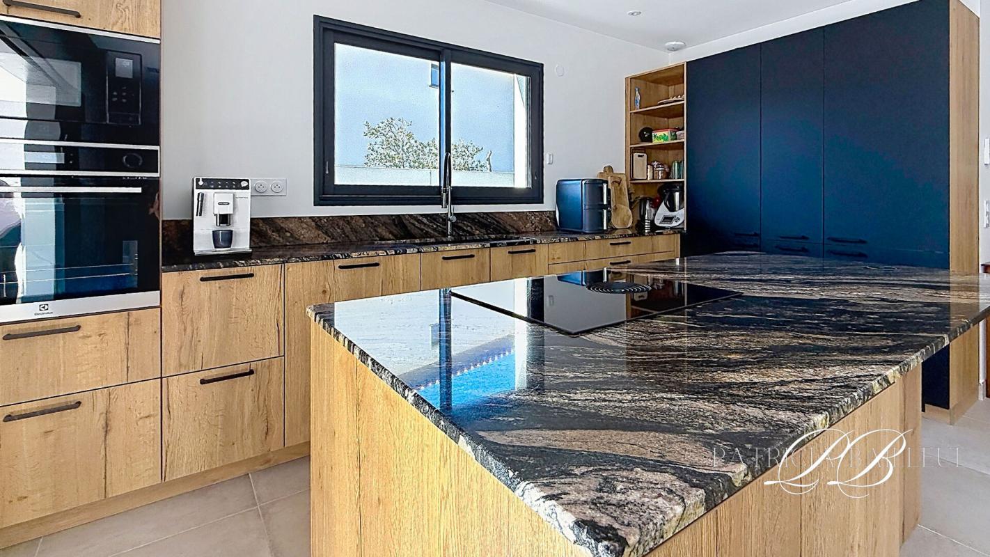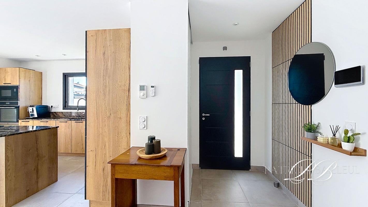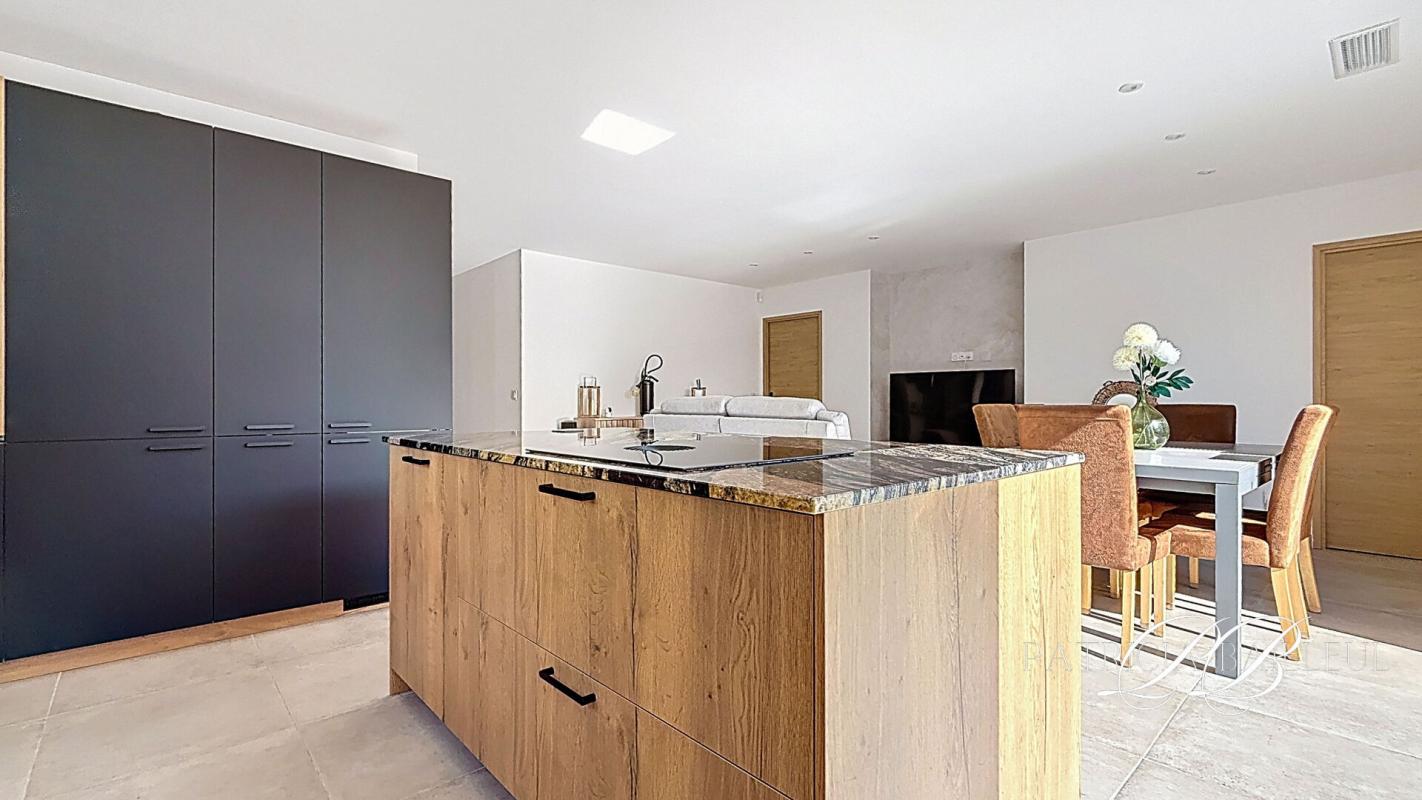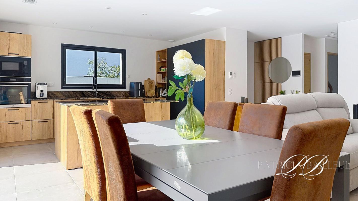 Dès l'entrée, la maison dévoile une pièce de vie ouverte, où le salon s'articule autour de larges baies à galandage, offrant une continuité naturelle vers l'extérieur. La cuisine, de standing avec électroménager haut de gamme s'intègre parfaitement à l'ensemble.