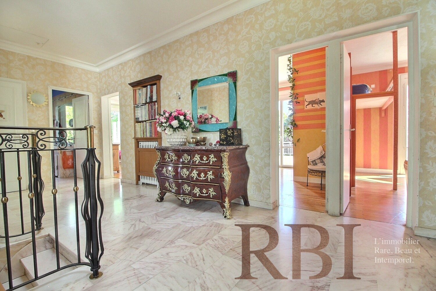 Un très bel escalier mène à l'étage où un grand palier avec un puit de lumière et rangements distribue 5 chambres, une salle d'eau et un wc. A ce niveau on découvre aussi un atelier lumineux et un bureau.