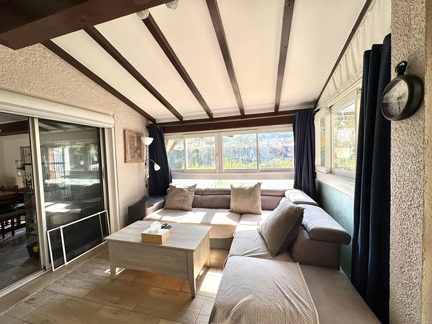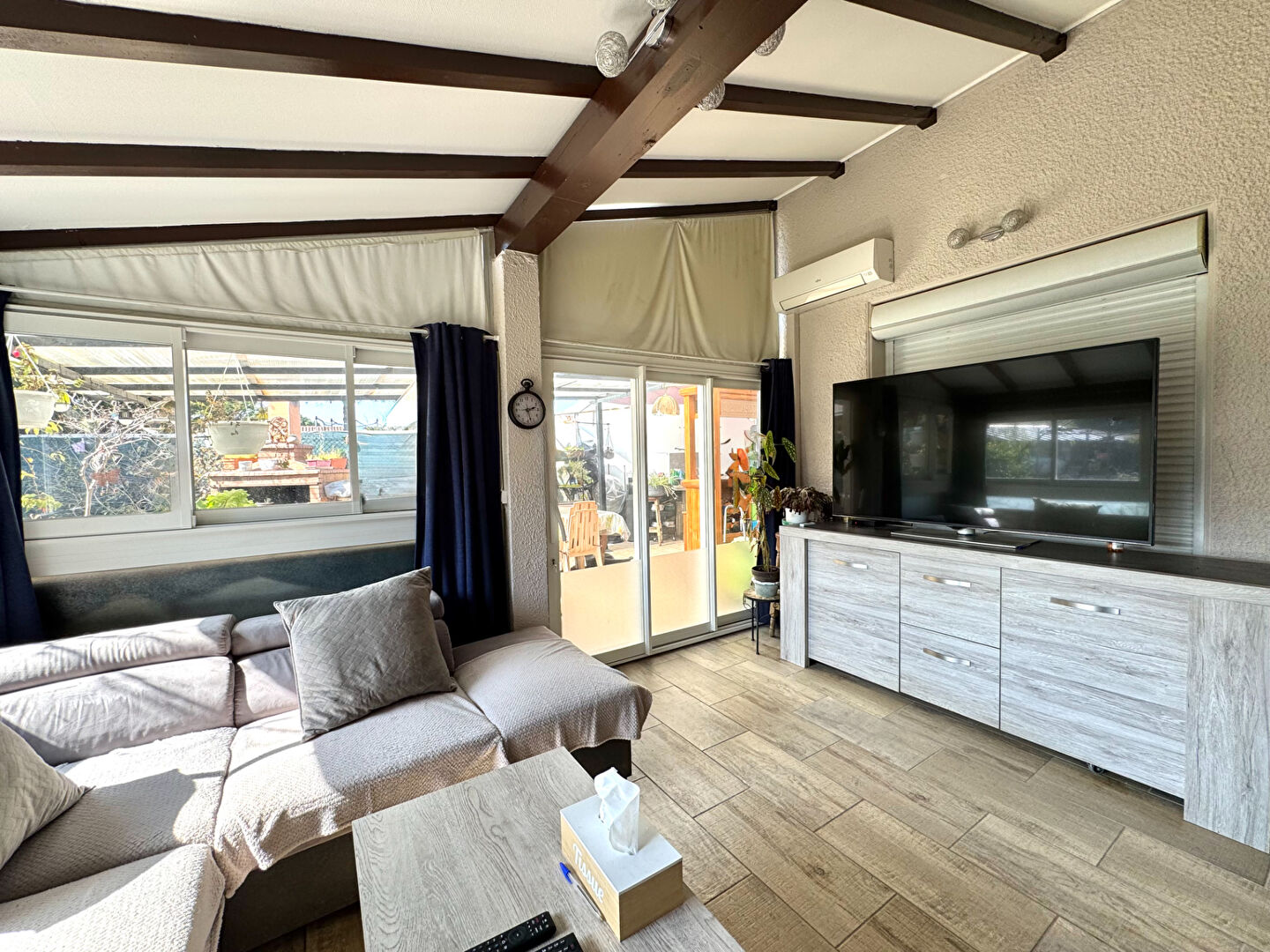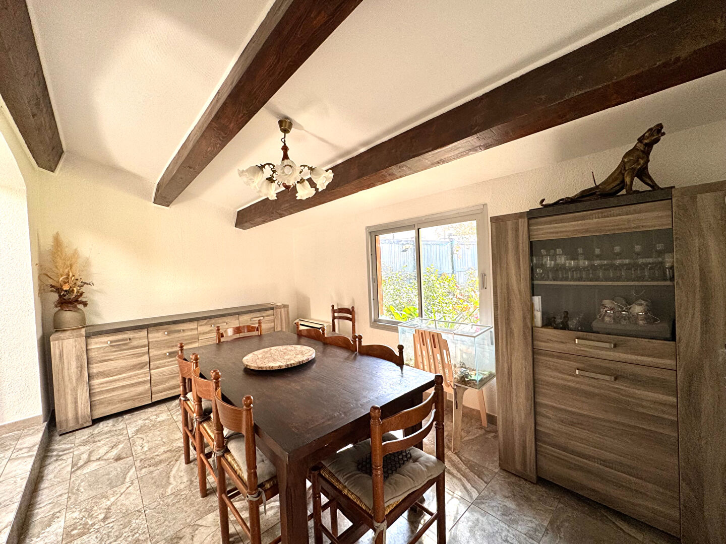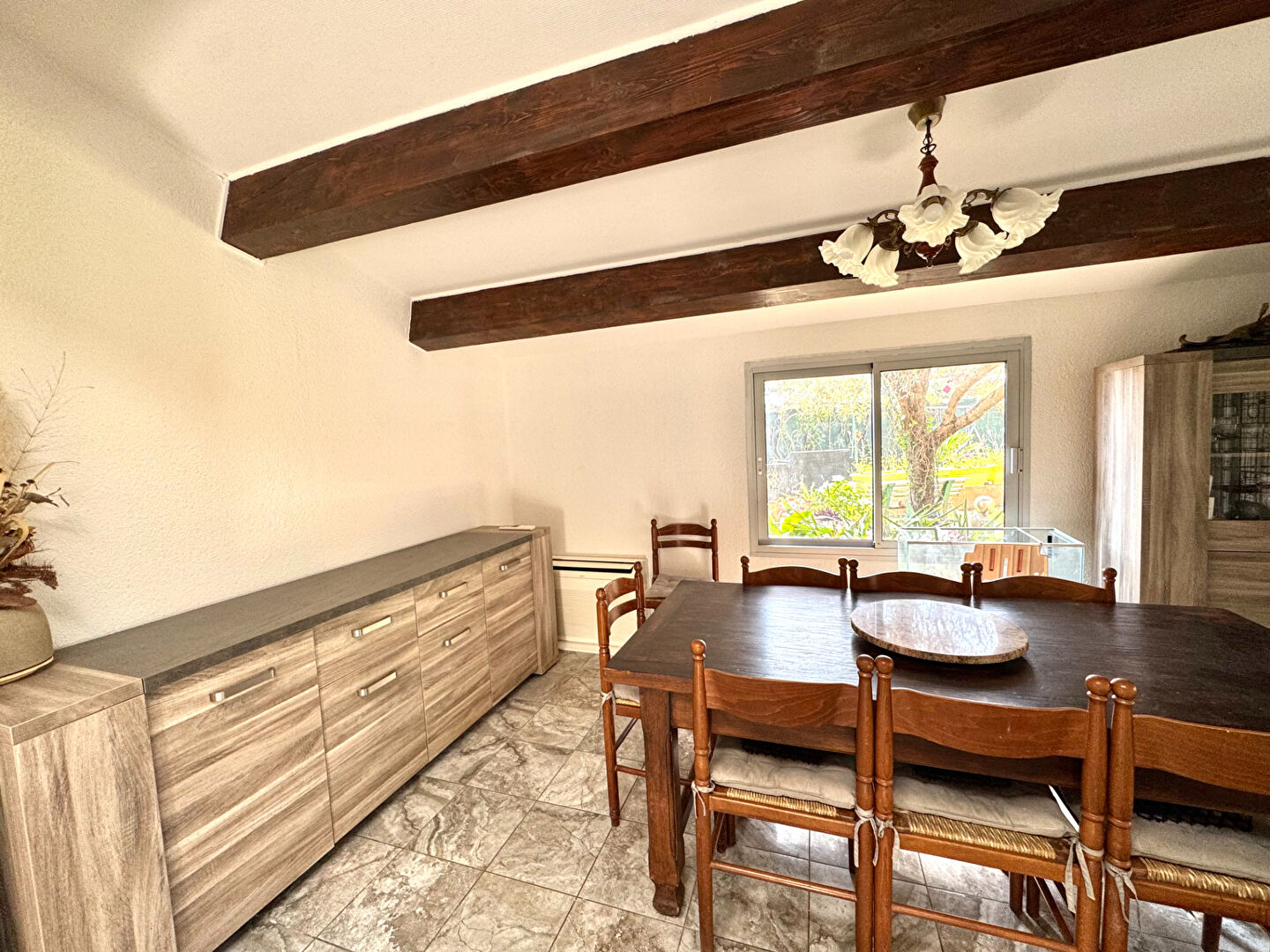 A vendre, résidence les Aigues Marines à Saint-Cyprien Plage : maison en R+1 avec au rez-de-chaussée, une cuisine ouverte équipée, un séjour , une chambre ,une salle d'eau et un WC . Dans le prolongement du salon, une véranda de 14m2 . L'ensemble donne sur un beau jardin clos d'environ 300m2 avec ses plantes, arbustes...et sa pergola dotée d'une cuisine d'été.
