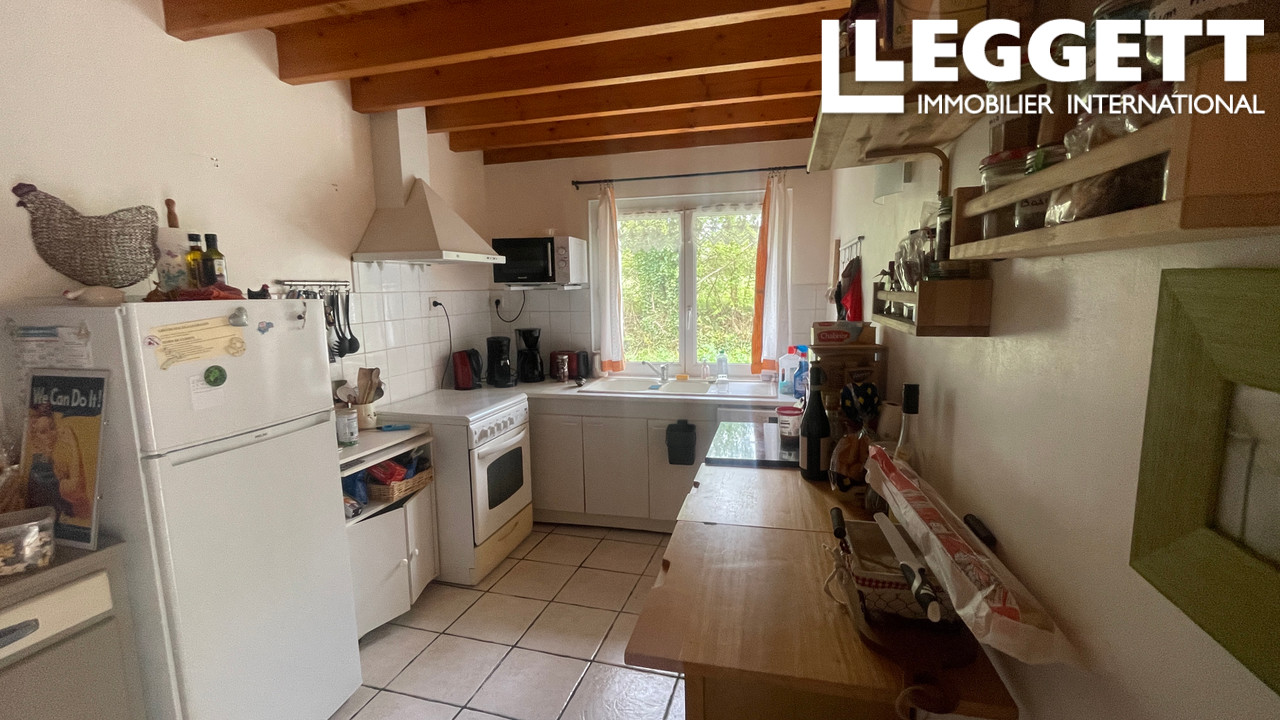 Cette maison comprend 2 chambres en enfilade, 1 salle de bains, 1 WC séparé, 1 pièce de vie avec un poêle à bois et une cuisine semi-ouverte.