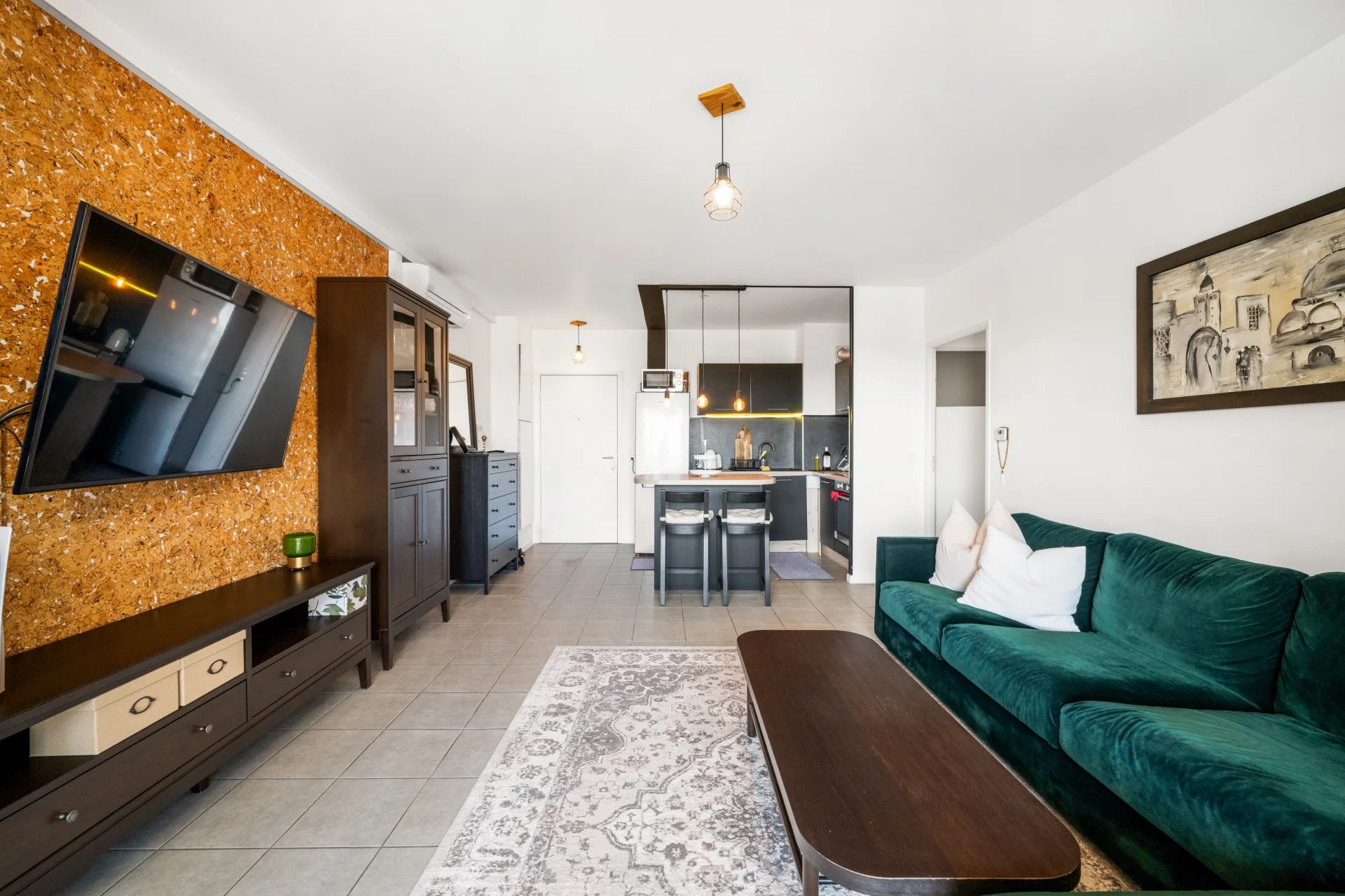 L’appartement est bien agencé et comprend une cuisine équipée ouverte sur le séjour, deux chambres, une salle de bains, un WC indépendant, ainsi qu’un dressing et un cellier. Il est également équipé d’une climatisation réversible.