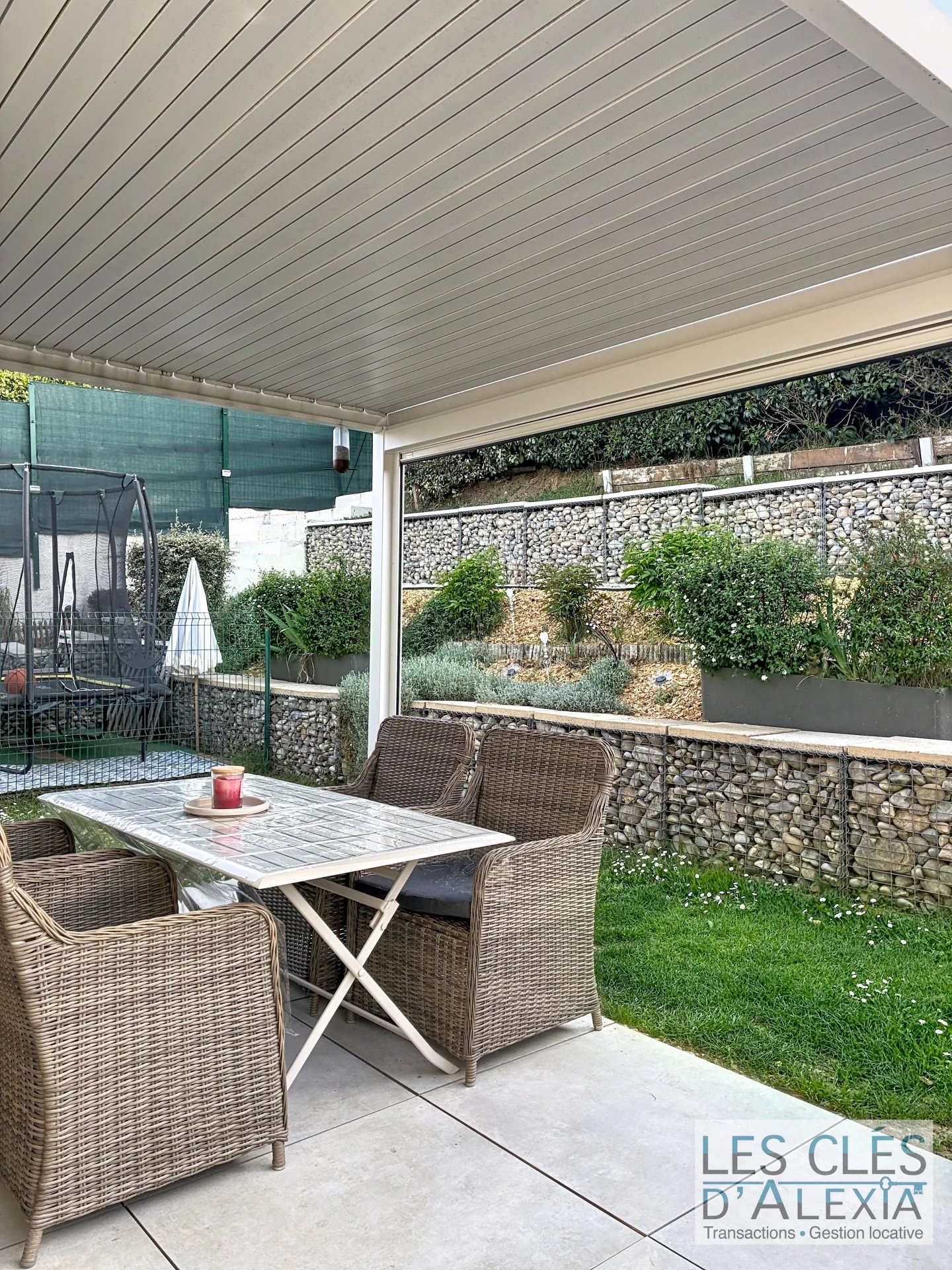 La cuisine, pratique, complètement aménagée et équipée (cuisson électrique) communique avec le séjour- salle à manger et son accès sur l'espace extérieur : la terrasse domine une succession de restanques aux lignes nettes et soigneusement aménagées.