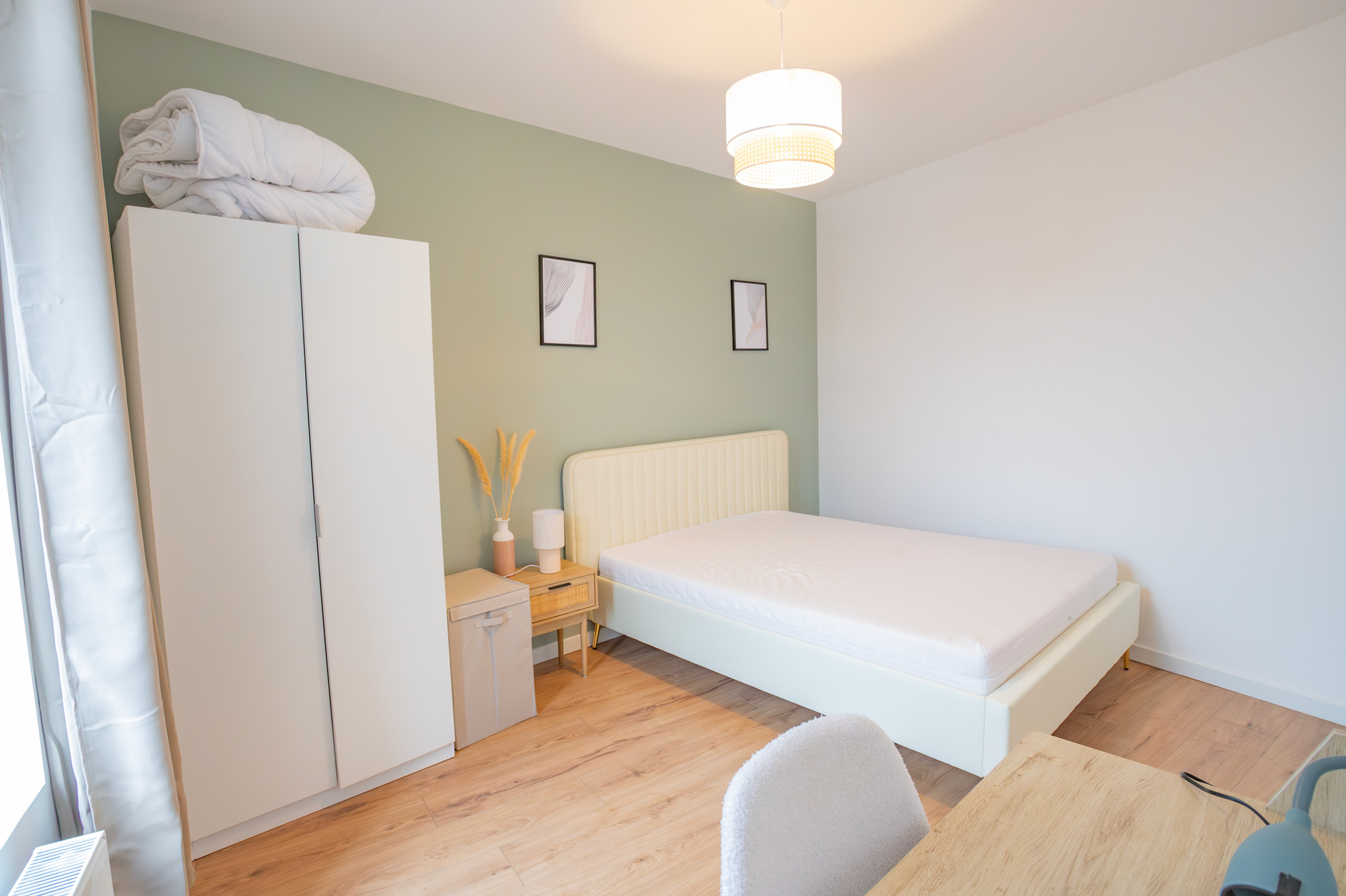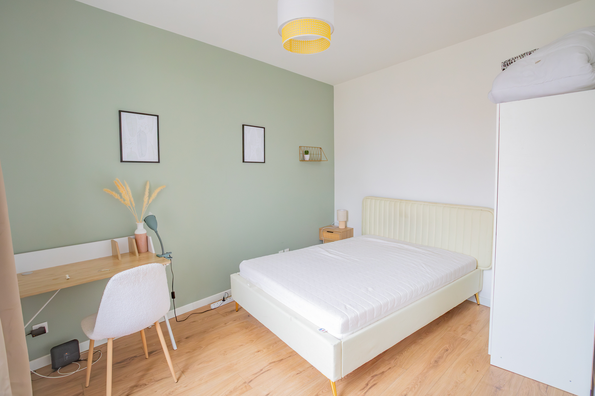 Une fois la porte franchie, à gauche une première chambre de 12m2 environ (vous ne la verrez pas en photo) et à droite la jolie cuisine très lumineuse. Elle est équipée et dispose d'un grand îlot central. Cette première chambre peut parfaitement redevenir une pièce de vie, soit une salle à manger ou un salon. Le propriétaire, investisseur, a souhaité proposer 4 chambres en location.