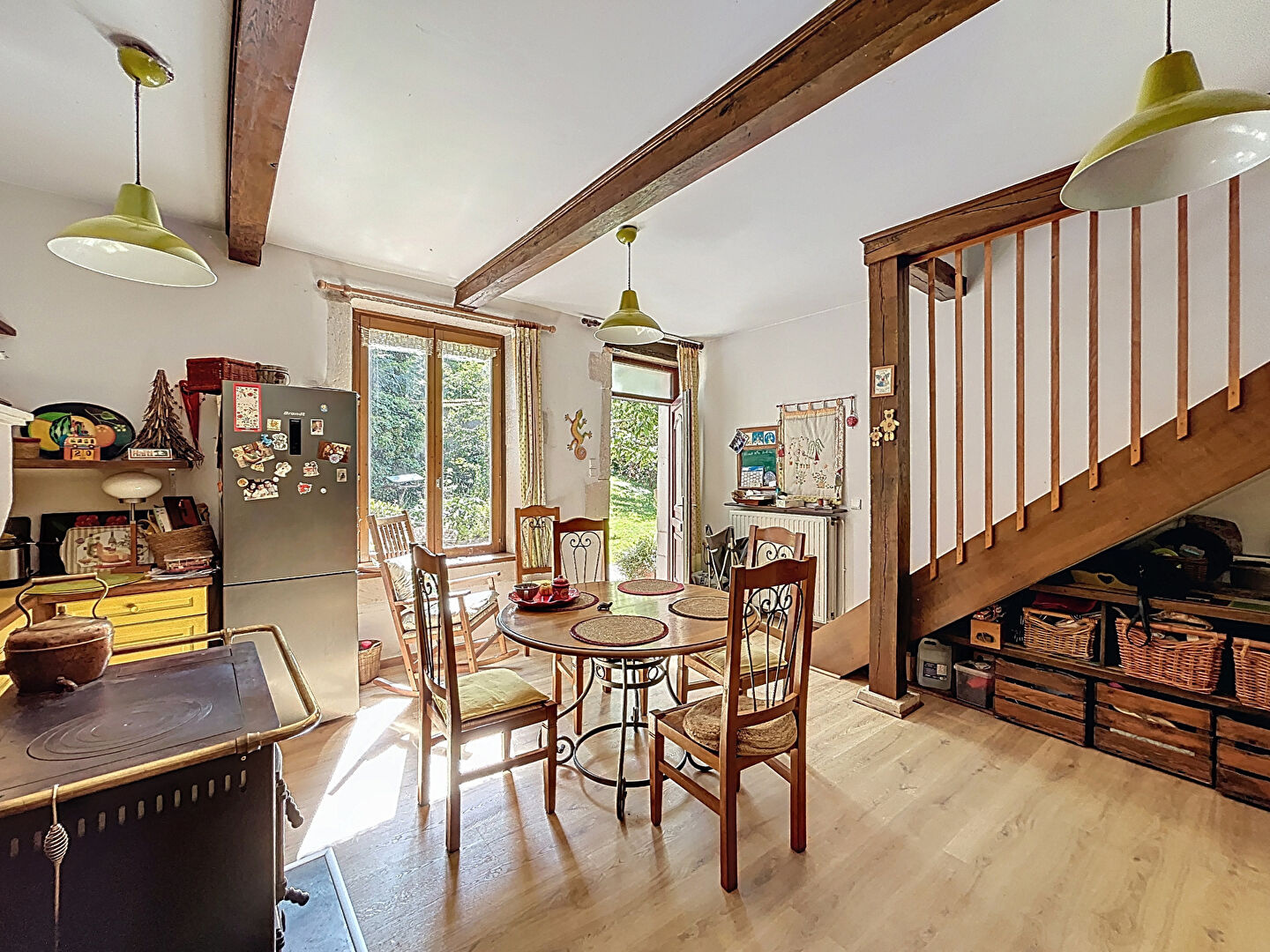 Avec au rez-de-chaussée : cuisine avec cheminée équipée d'une cuisinière à bois et un appartement indépendant avec cuisine sur séjour avec poêl à bois, 2 pièces, salle d'eau, WC.
