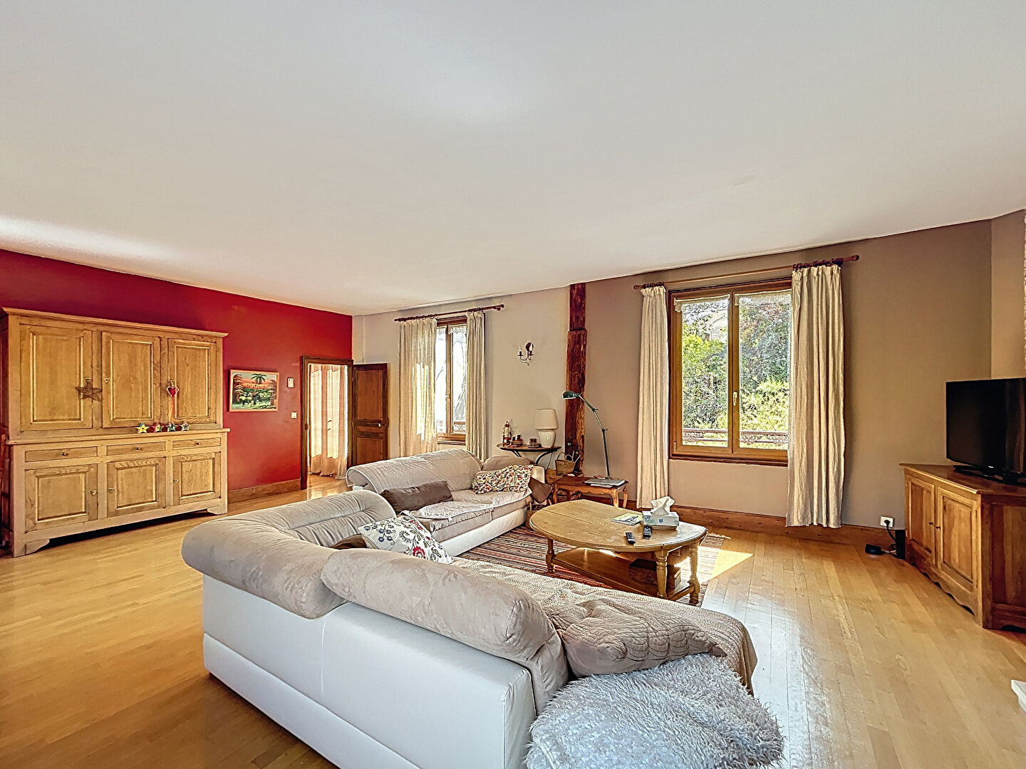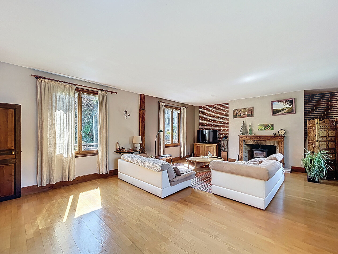 -Superbe pièce de vie (45 m2) : très lumineuse, sol parquet chêne, belle cheminée tubée équipée d'un poêle à bois, fenêtres ;