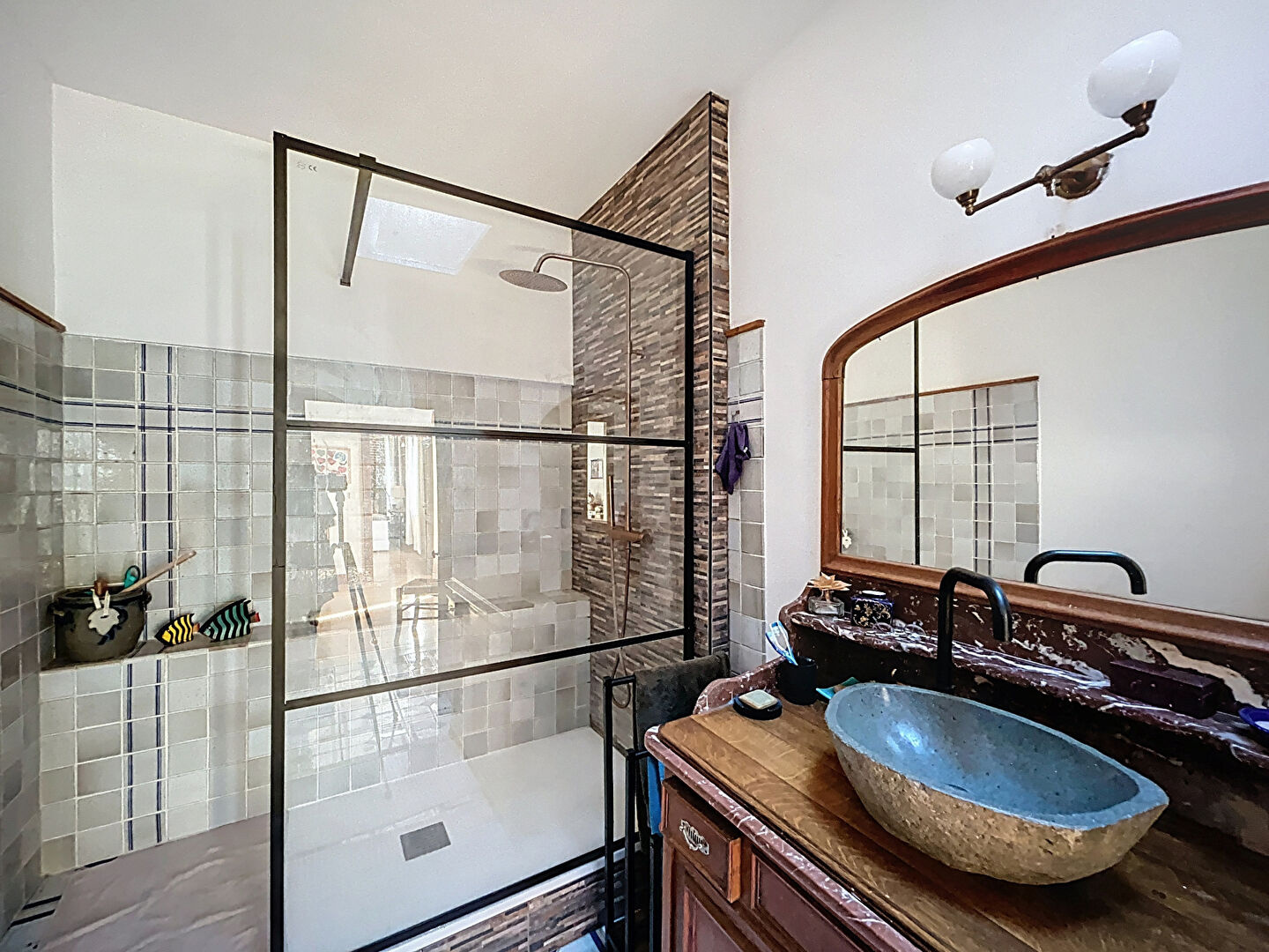 -Salle d'eau (6,70 m2) : sol carrelage, meuble vasque, douche, chaudière 'VIESSMANN' au gaz de ville alimentant une installation de chauffage centra ;