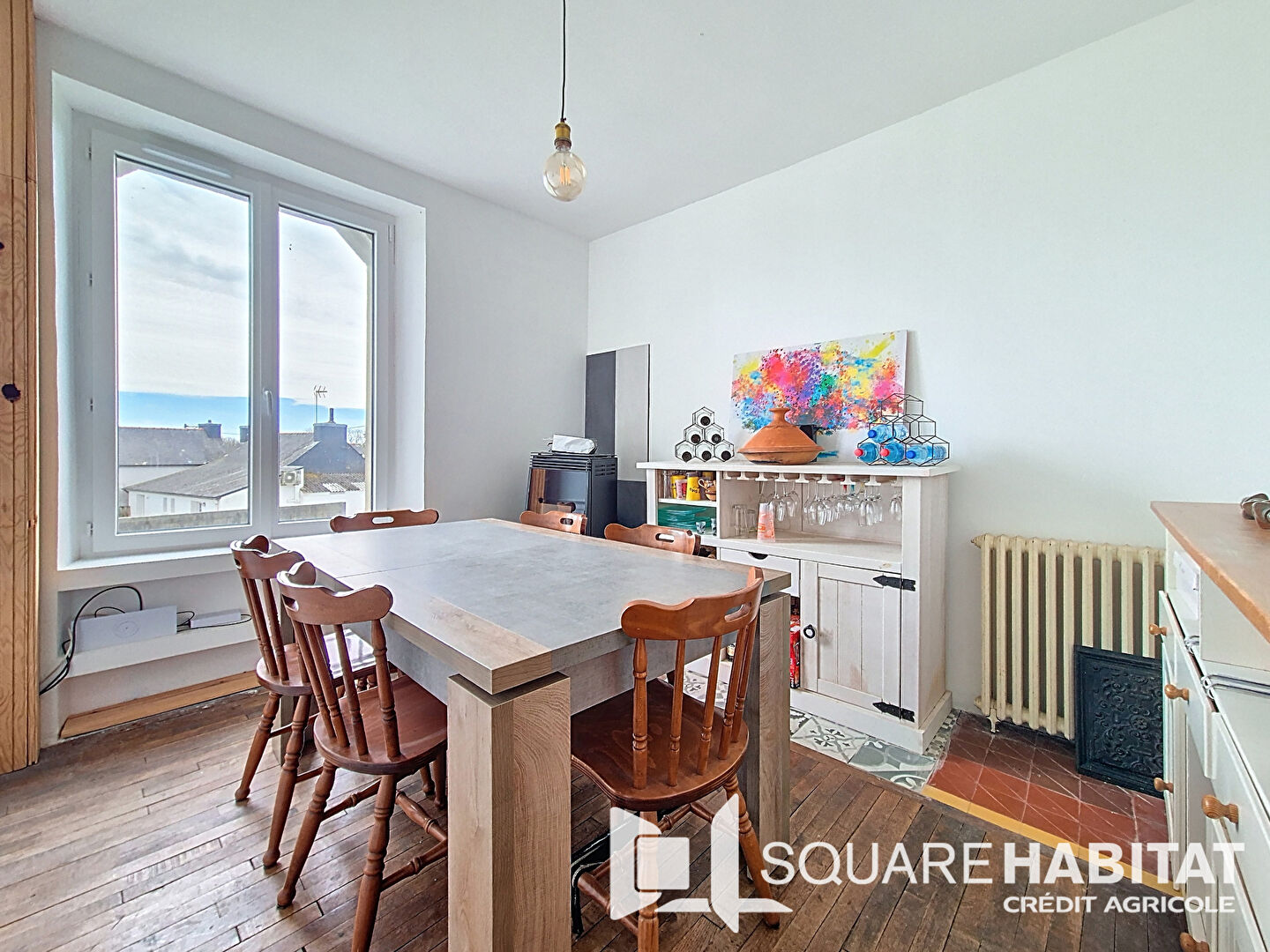- Au rez-de-chaussée : entrée, salon, salle à manger avec poêle à pellets exposée Sud, cuisine récente améngée et équipée exposée Sud, une chambre, toilettes séparés.