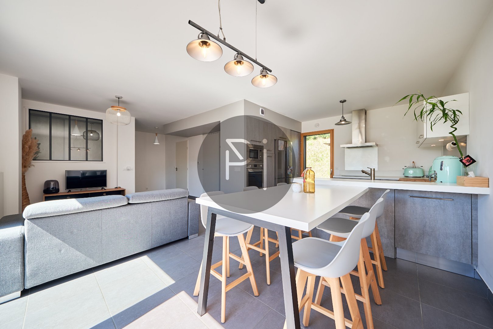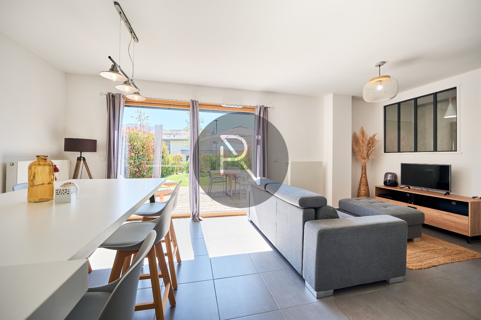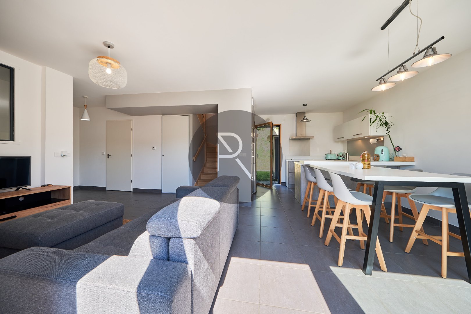 - au niveau 0, hall entrée avec placards, pièce de vie lumineuse avec cuisine ouverte équipée, un accès jardin côté Ouest, un autre depuis la cuisne côté Est.