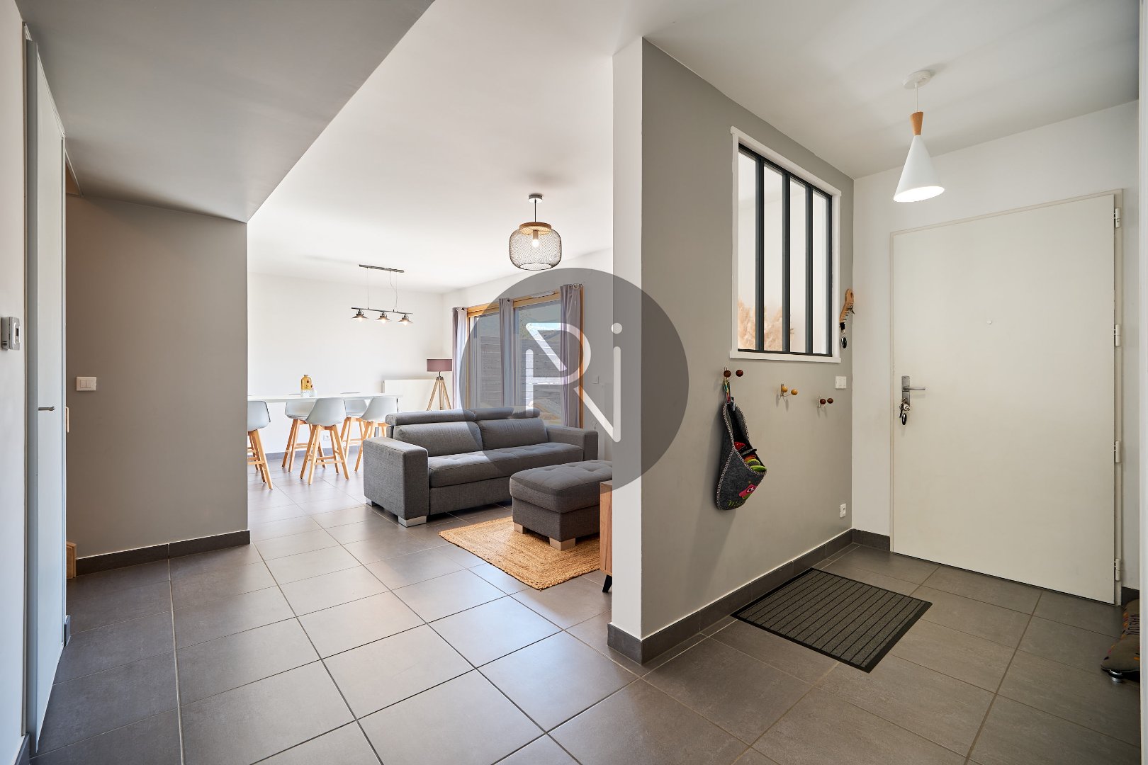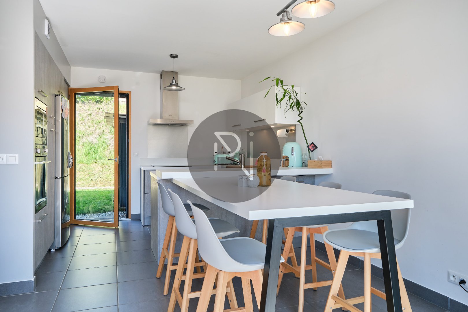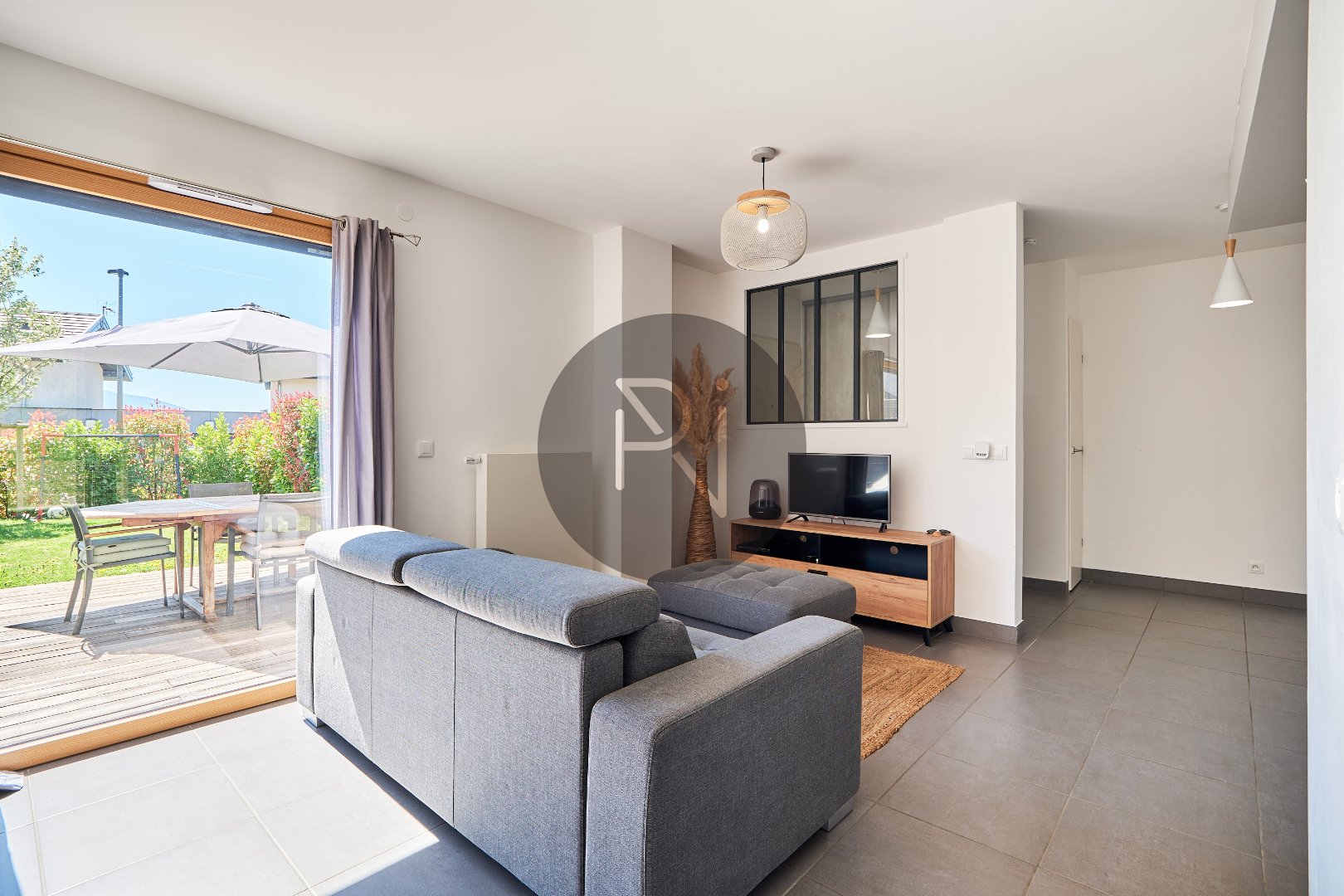 - au niveau 0, hall entrée avec placards, pièce de vie lumineuse avec cuisine ouverte équipée, un accès jardin côté Ouest, un autre depuis la cuisne côté Est.
