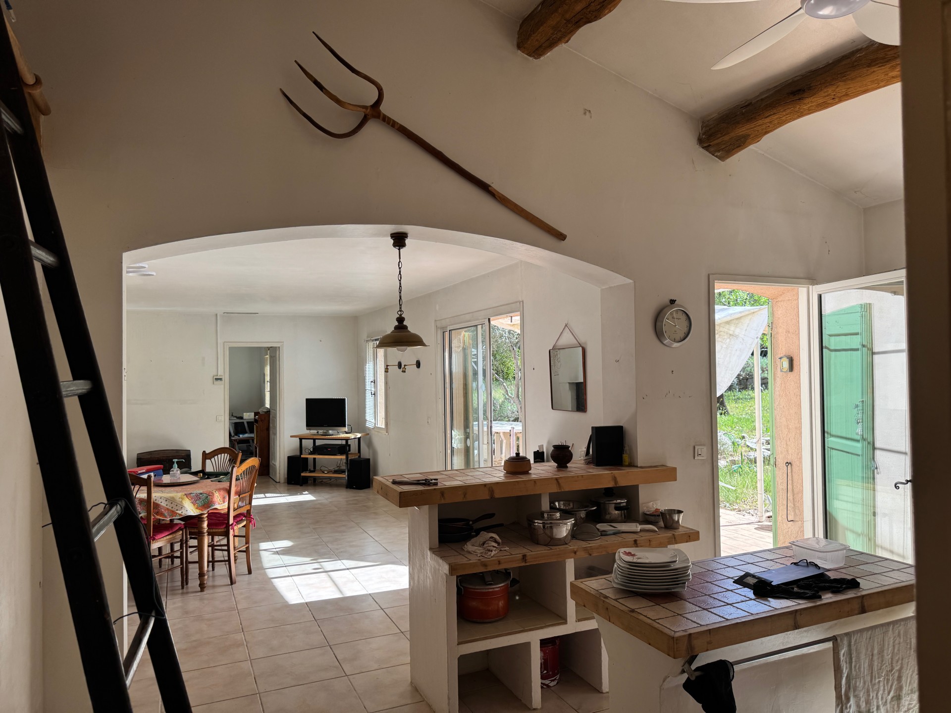 La maison propose une belle pièce de vie d?environ 50 m² avec une cuisine ouverte sur le salon/séjour, créant un espace convivial et chaleureux. Une arrière-cuisine/buanderie vient compléter cet espace.