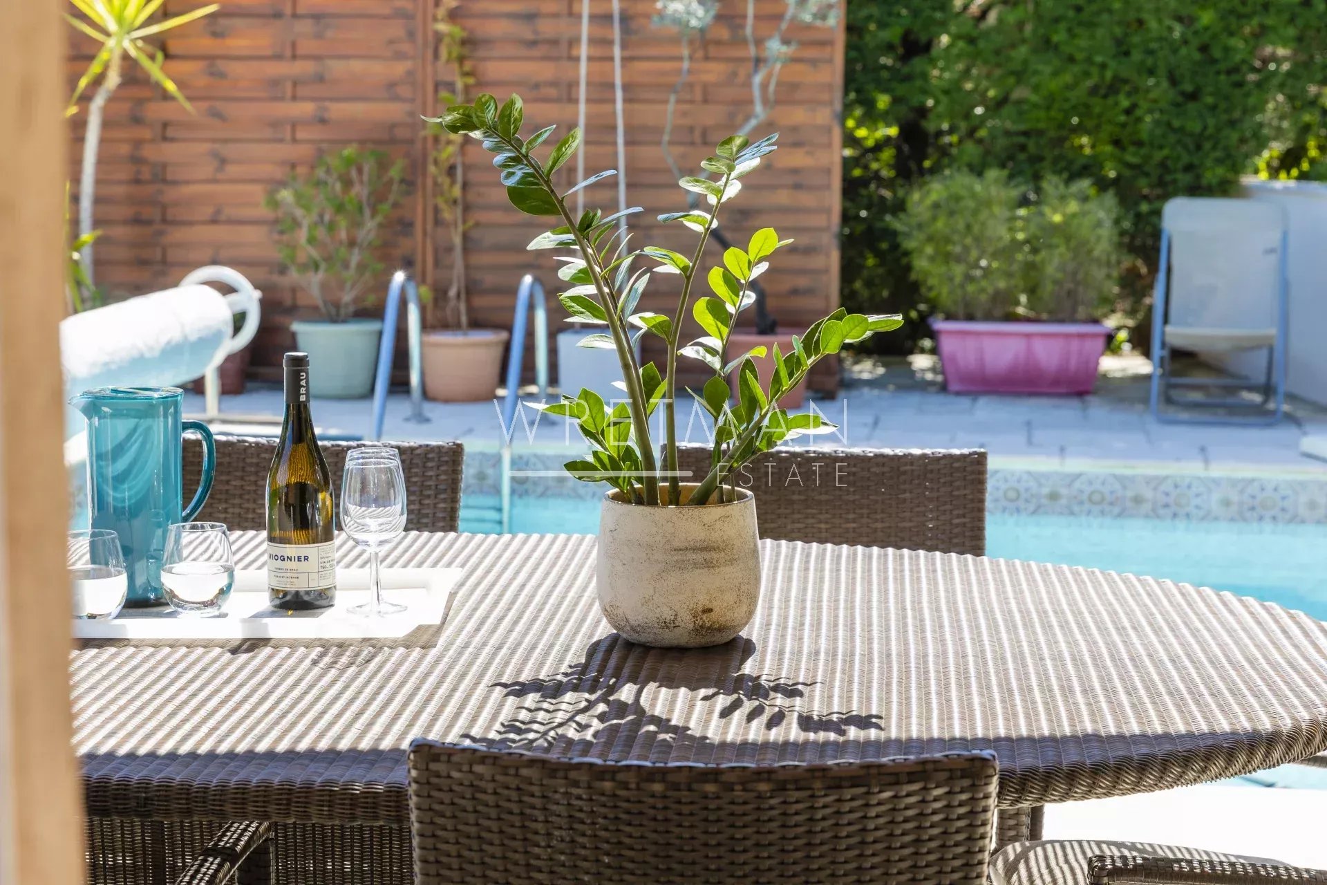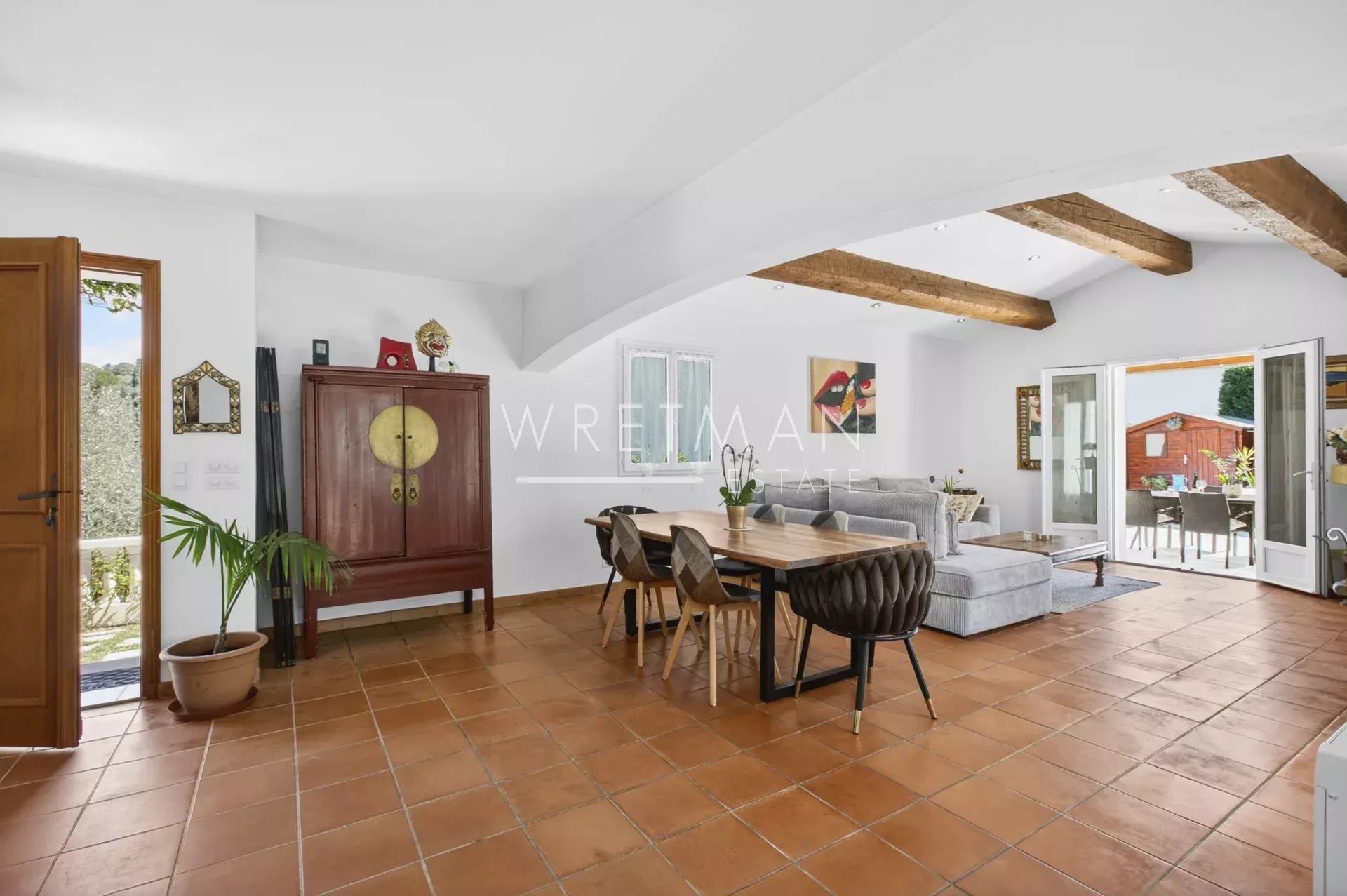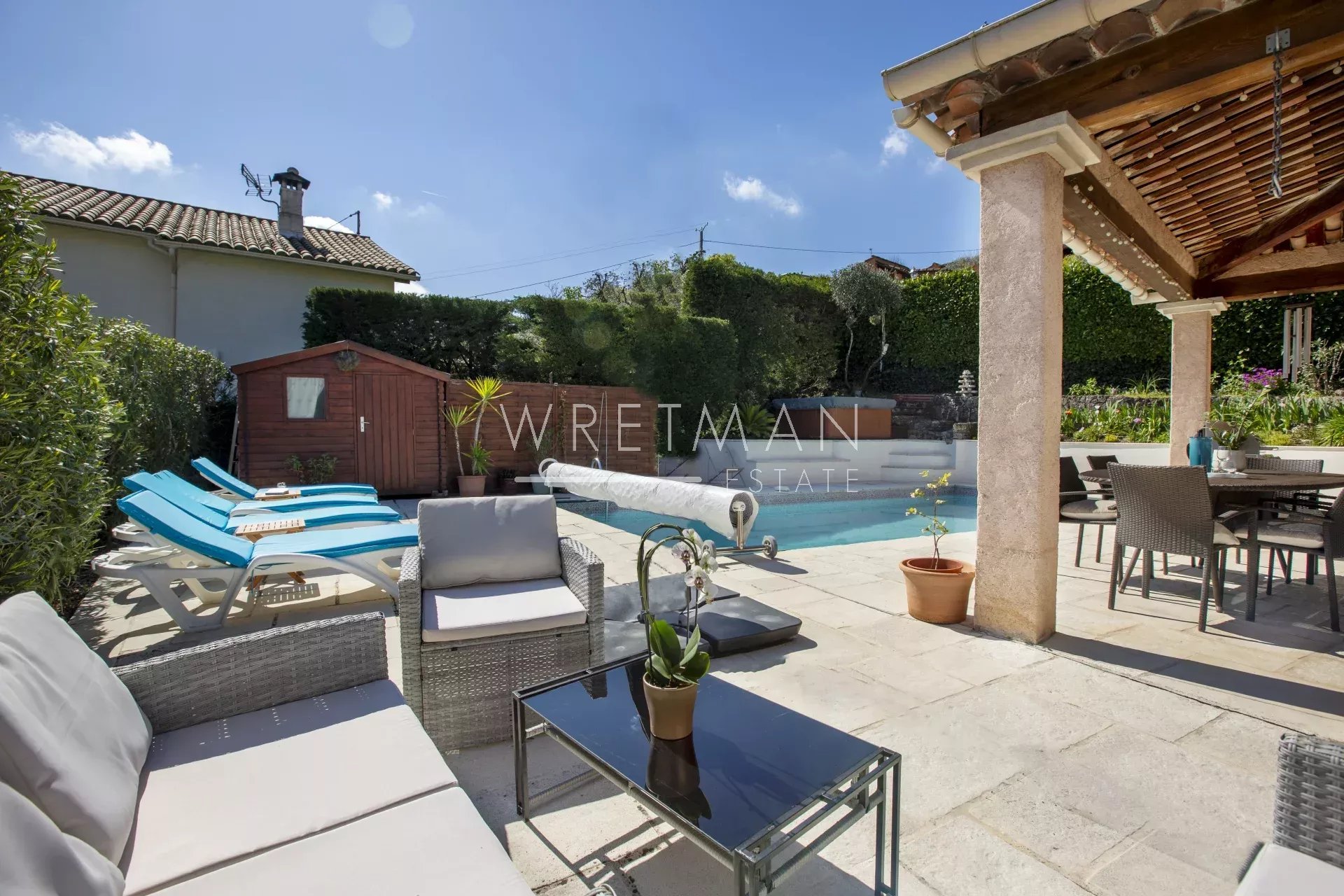 De belles terrasses entourent la maison, parfaites pour profiter pleinement des extérieurs et du climat azuréen. Une piscine de 11 x 5 mètres s’intègre harmonieusement dans le jardin d’environ 750 m2.