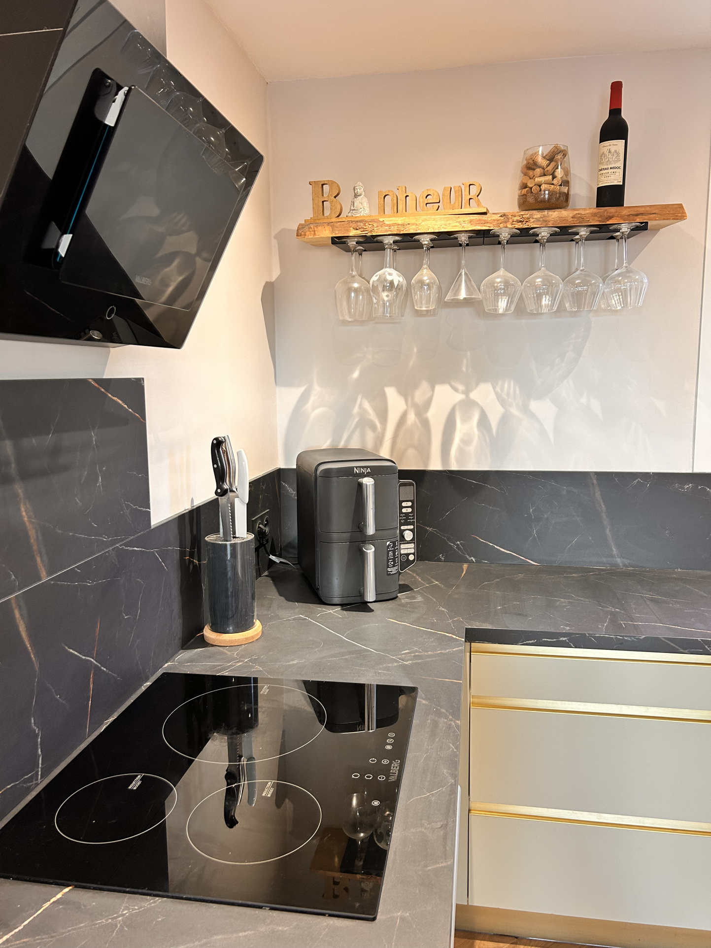 Vous profiterez d'une cuisine moderne, entièrement aménagée et équipée, ouverte sur un vaste salon/séjour baigné de lumière.