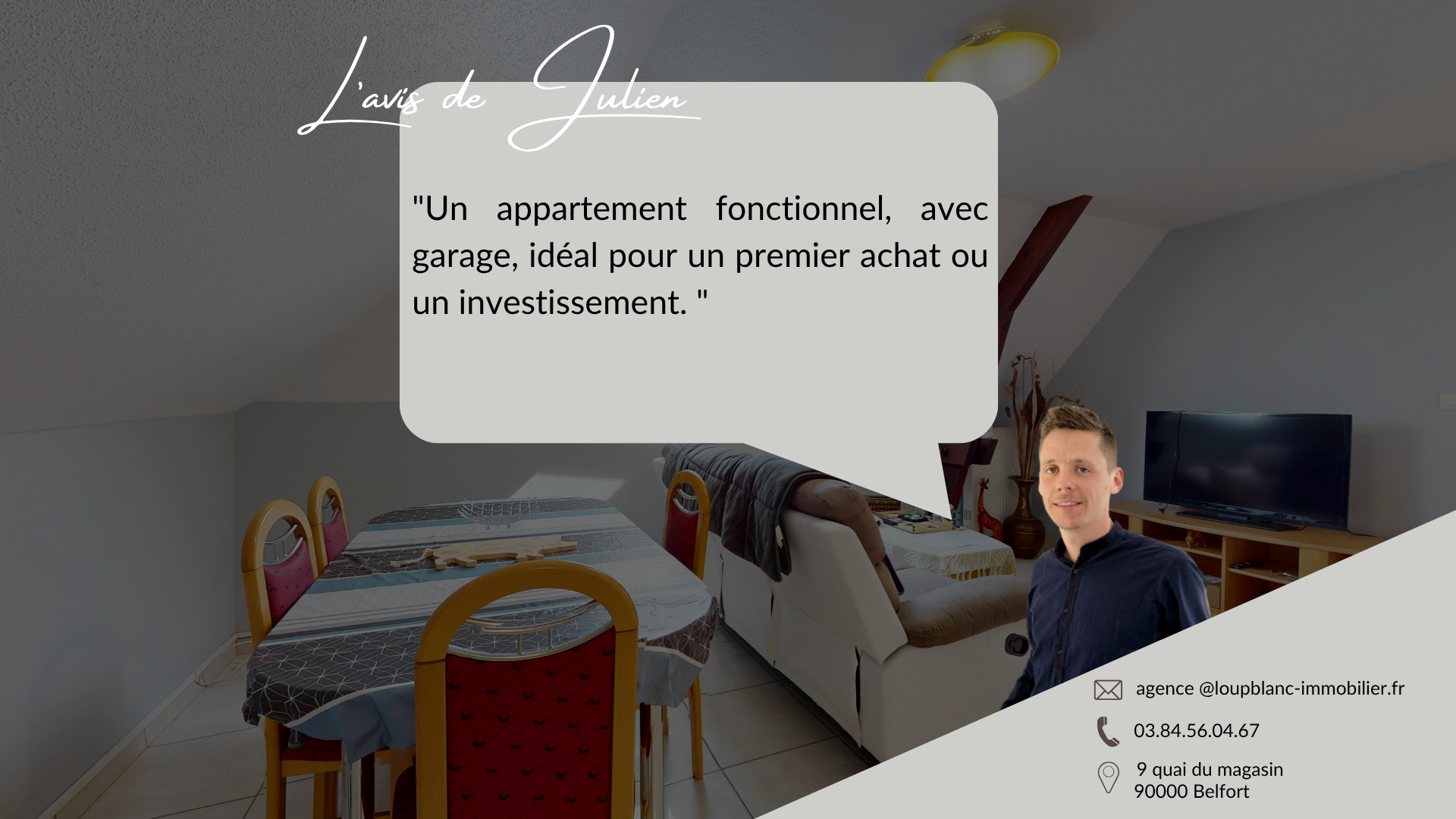 L'avis de Julien : « Un appartement fonctionnel, avec garage, idéal pour un premier achat ou un investissement. »