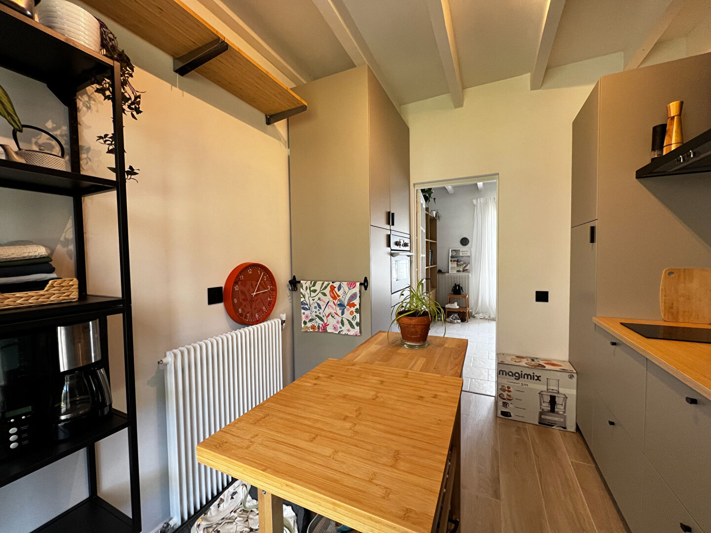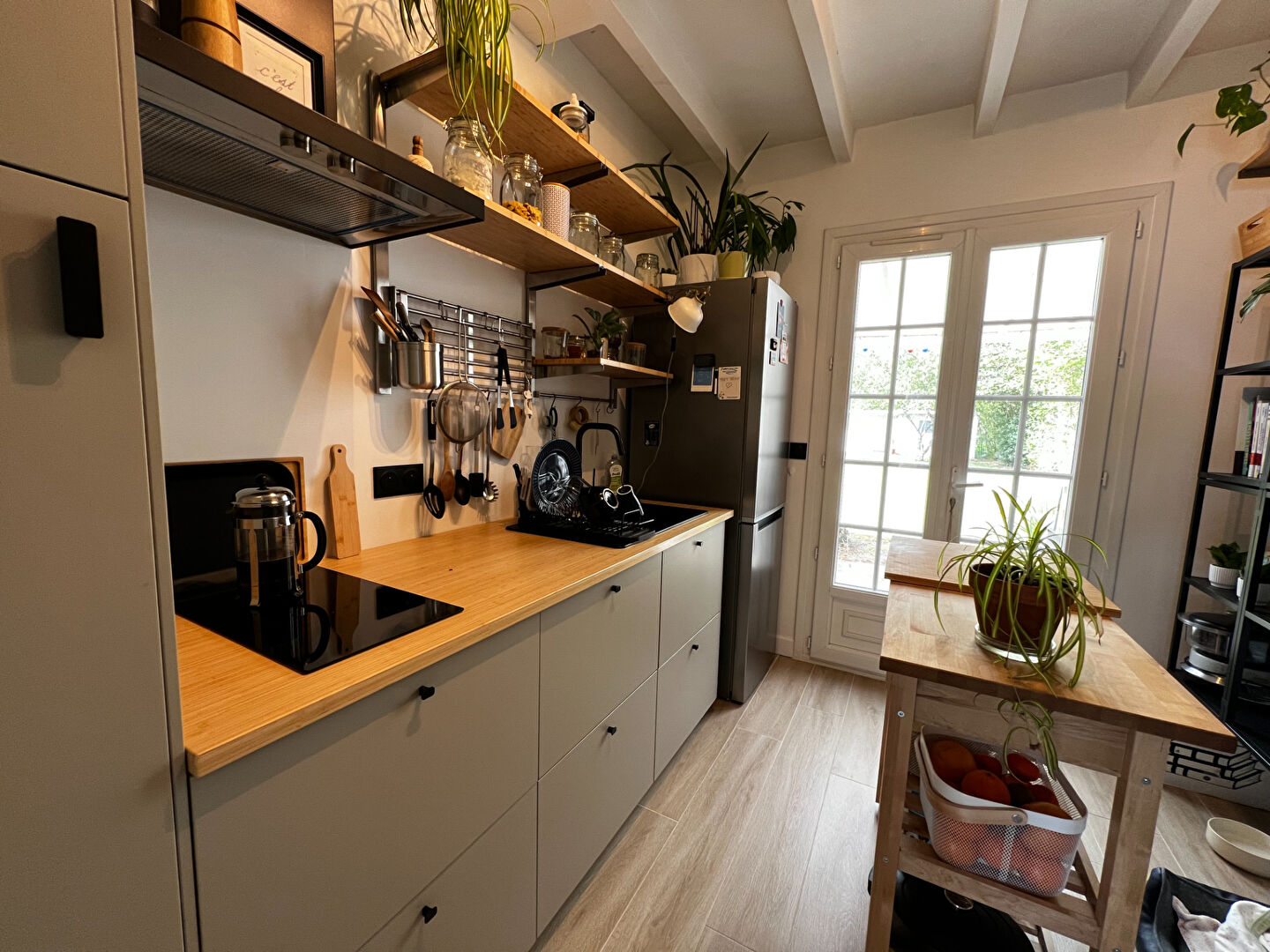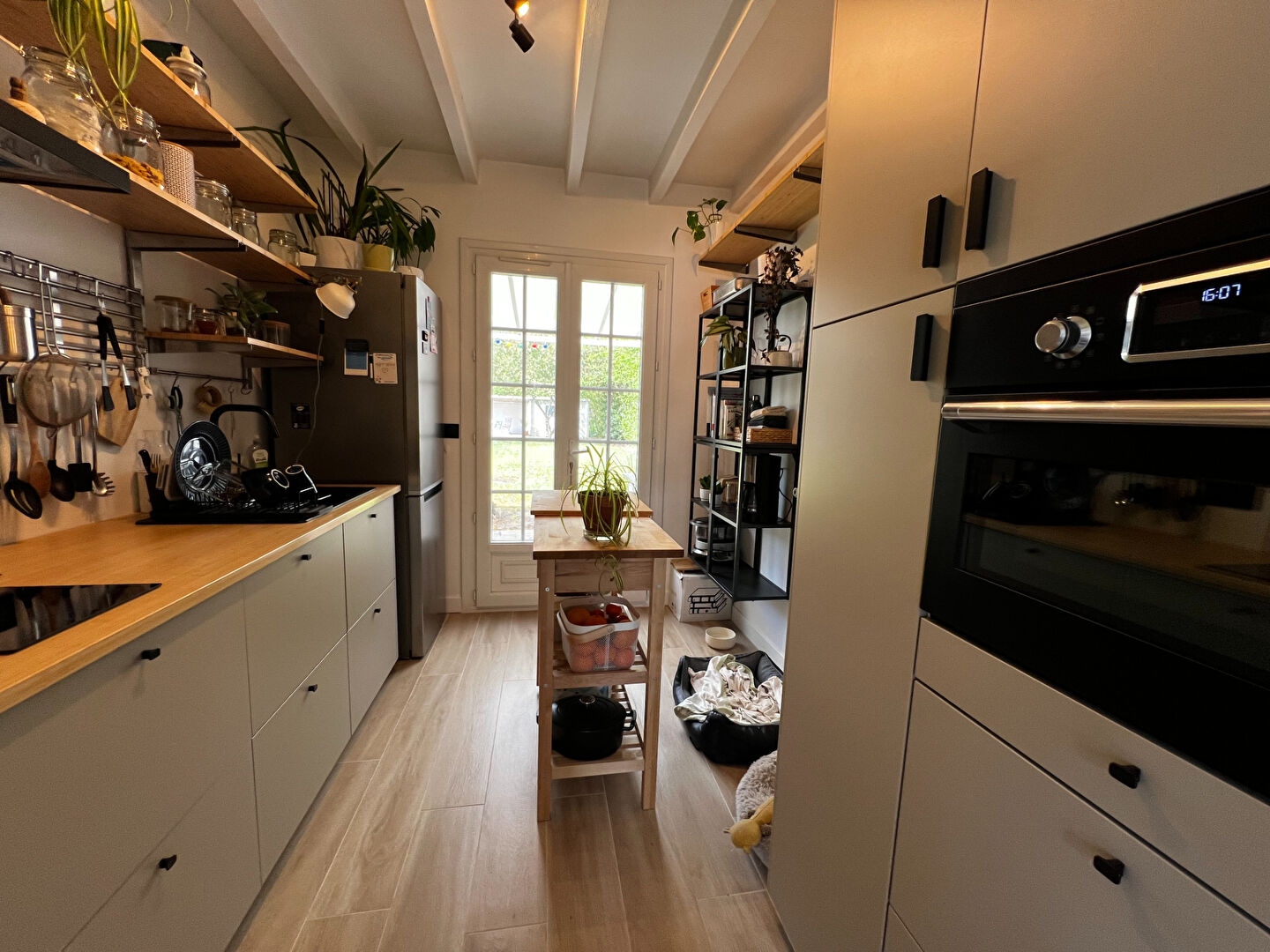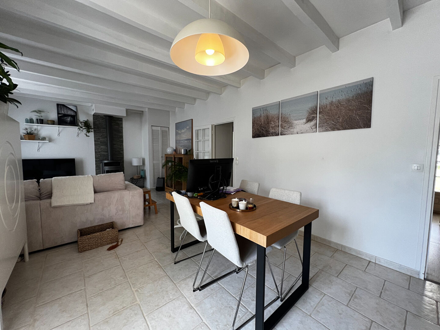 Elle se compose d'un agréable séjour/salon chaleureux, agrémenté d'un poêle à bois, parfait pour vos soirées cocooning, ainsi que d'une cuisine entièrement équipée et aménagée, fonctionnelle et moderne.
