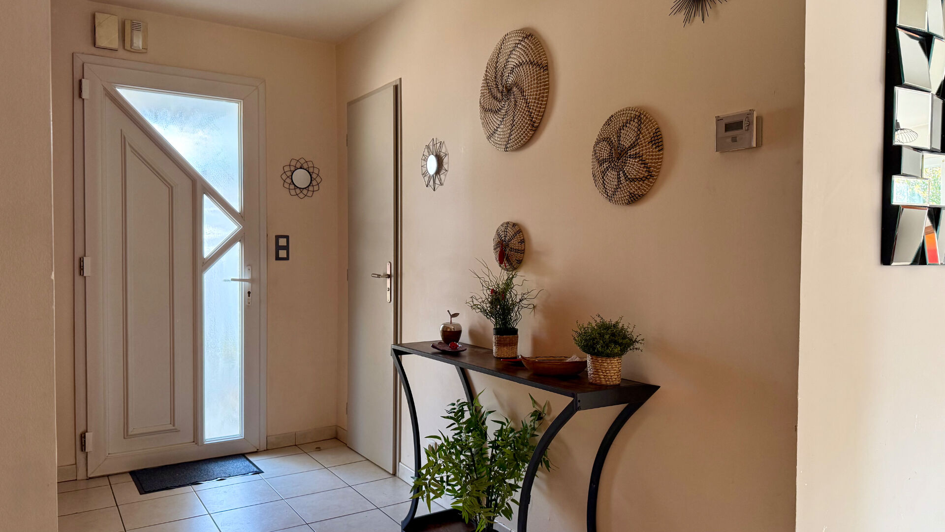 Elle propose un grand hall d'entrée, une cuisine ouverte sur le salon-séjour, WC, cellier, salle de bains complète, trois chambres et un bureau. l'accessibilité PMR pour tout le RDC.