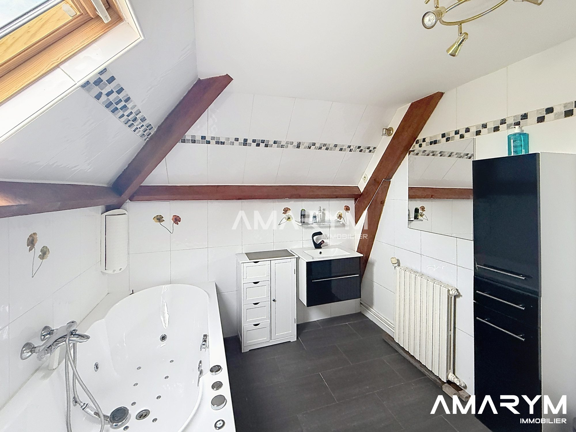 à l'étage, un palier dessert deux chambres , une salle de bains avec WC et un grenier.