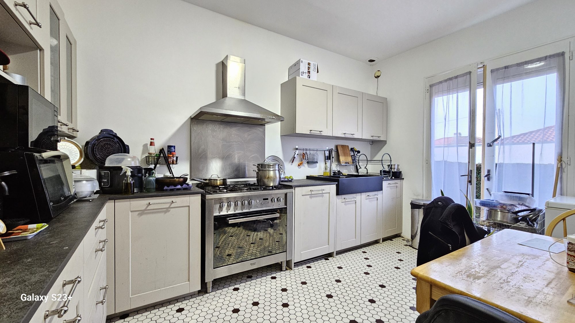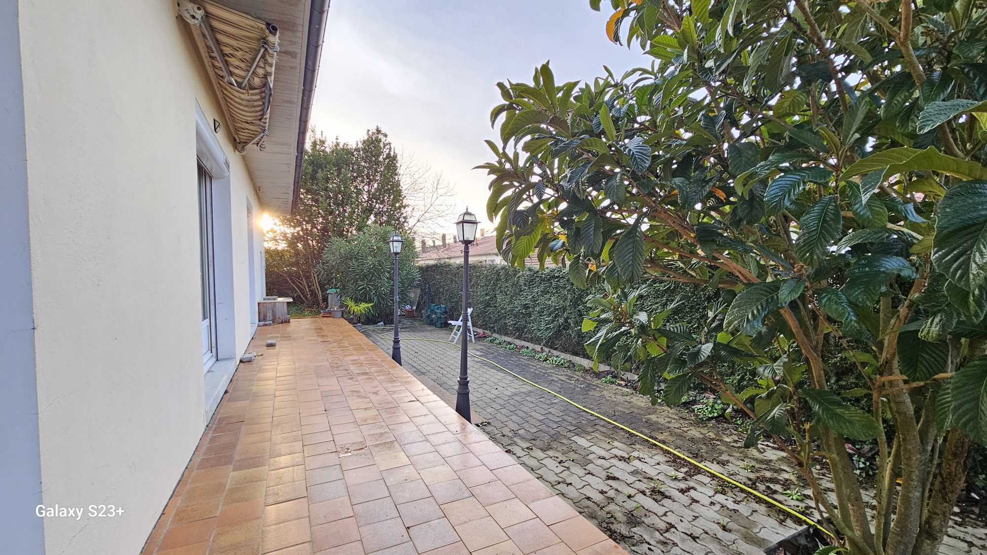 Exclusivité ! Maison de plain-pied d'environ 100 m² hab., comprenant : entrée, cuisine équipée, salon-séjour, couloir avec placards, 3 chambres dont deux avec placard, salle de bains, WC. Garage attenant. Terrasse carrelée avec store banne, cour pavée et jardinet. Terrain clos de 443 m².