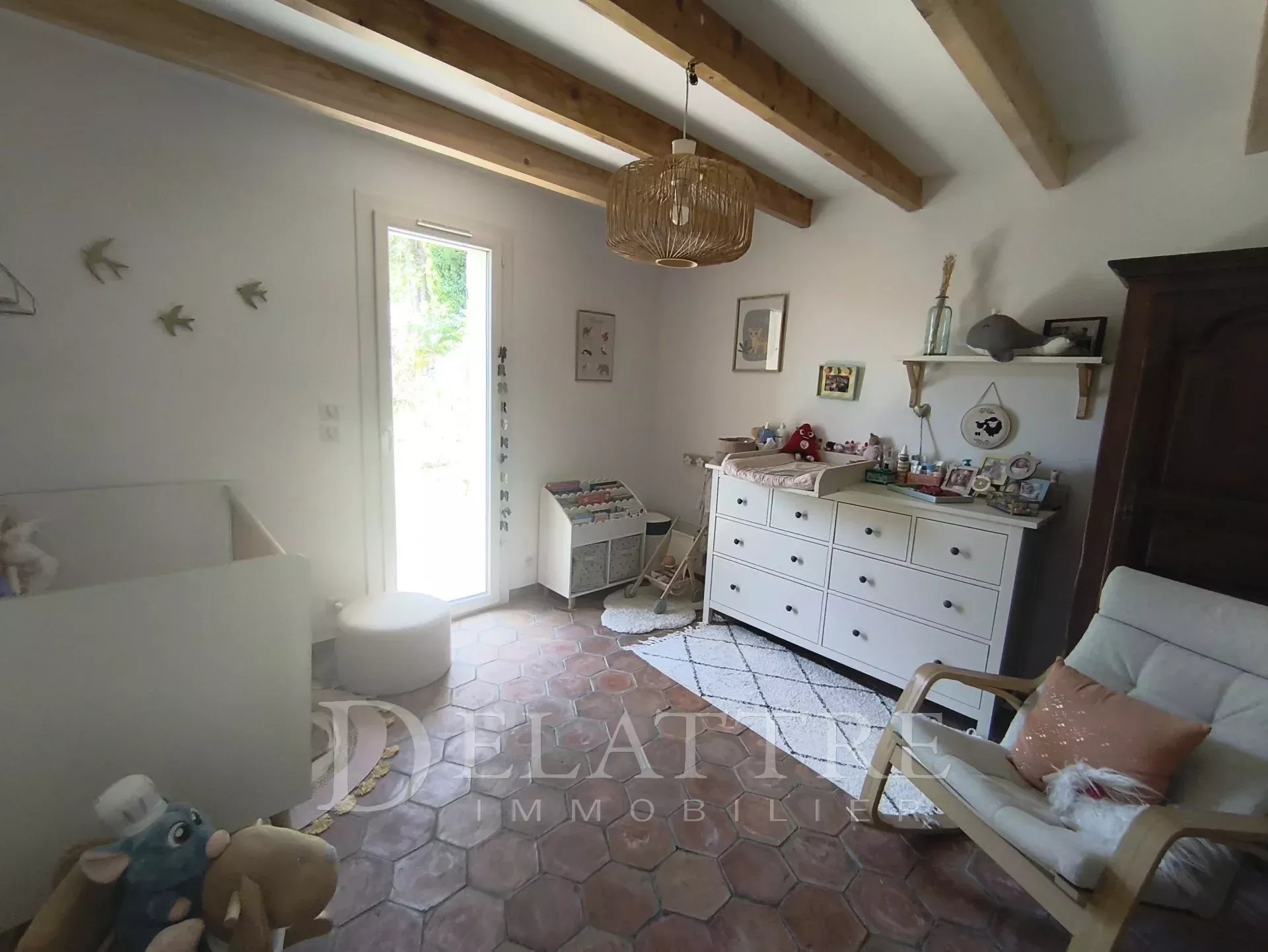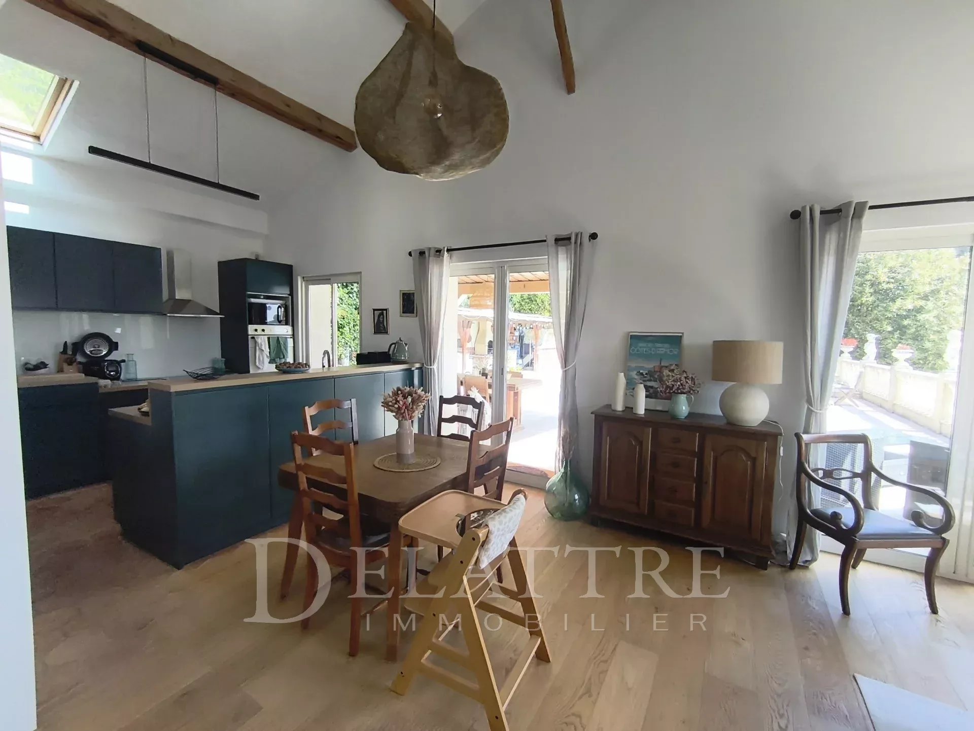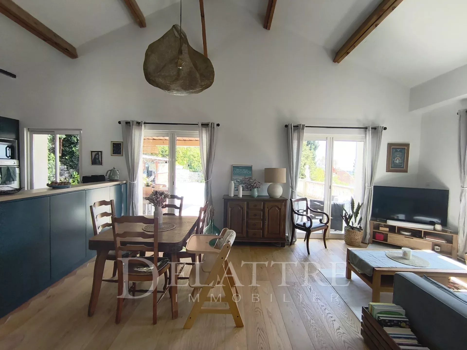 À l’extérieur, le terrain d’environ 995 m², joliment arboré, évoque un véritable coin de campagne : une piscine pour les journées ensoleillées, une cuisine d’été propice aux repas en plein air.
