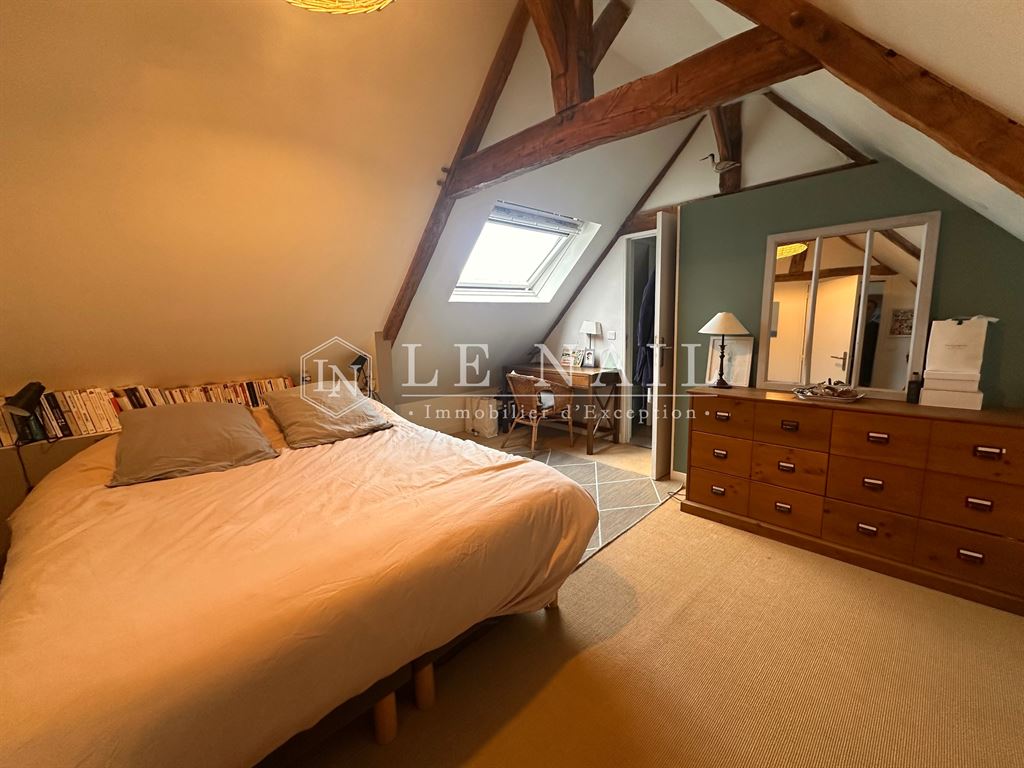 Au second étage, sous les combles, se trouve une agréable suite parentale comprenant une chambre lumineuse grâce à un grand vélux, une salle de bains équipée d’une douche et d’une baignoire, des toilettes ainsi qu’un dressing.