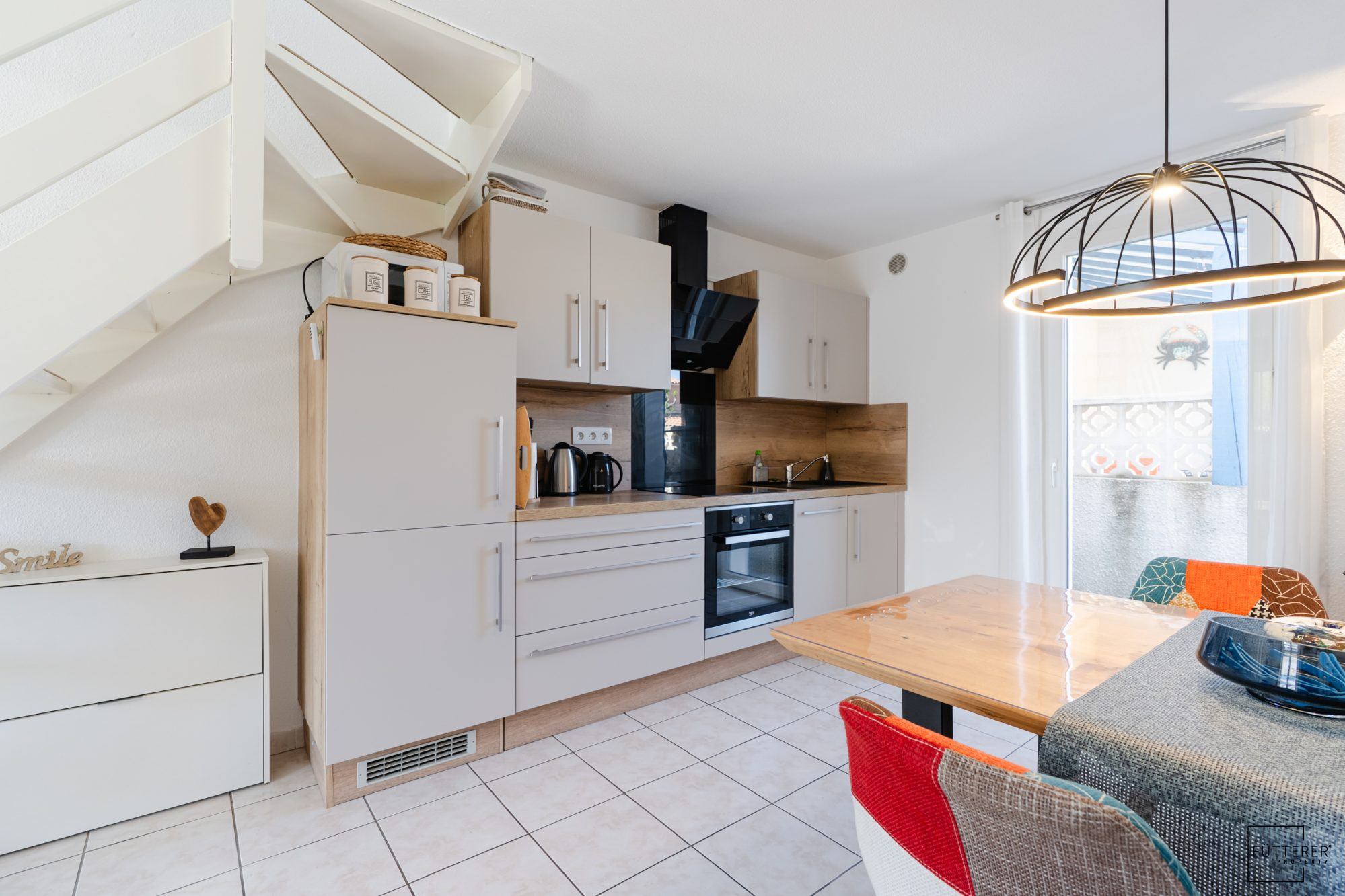 -Au rez-de-chaussée : séjour avec cuisine équipée, belle salle d'eau!