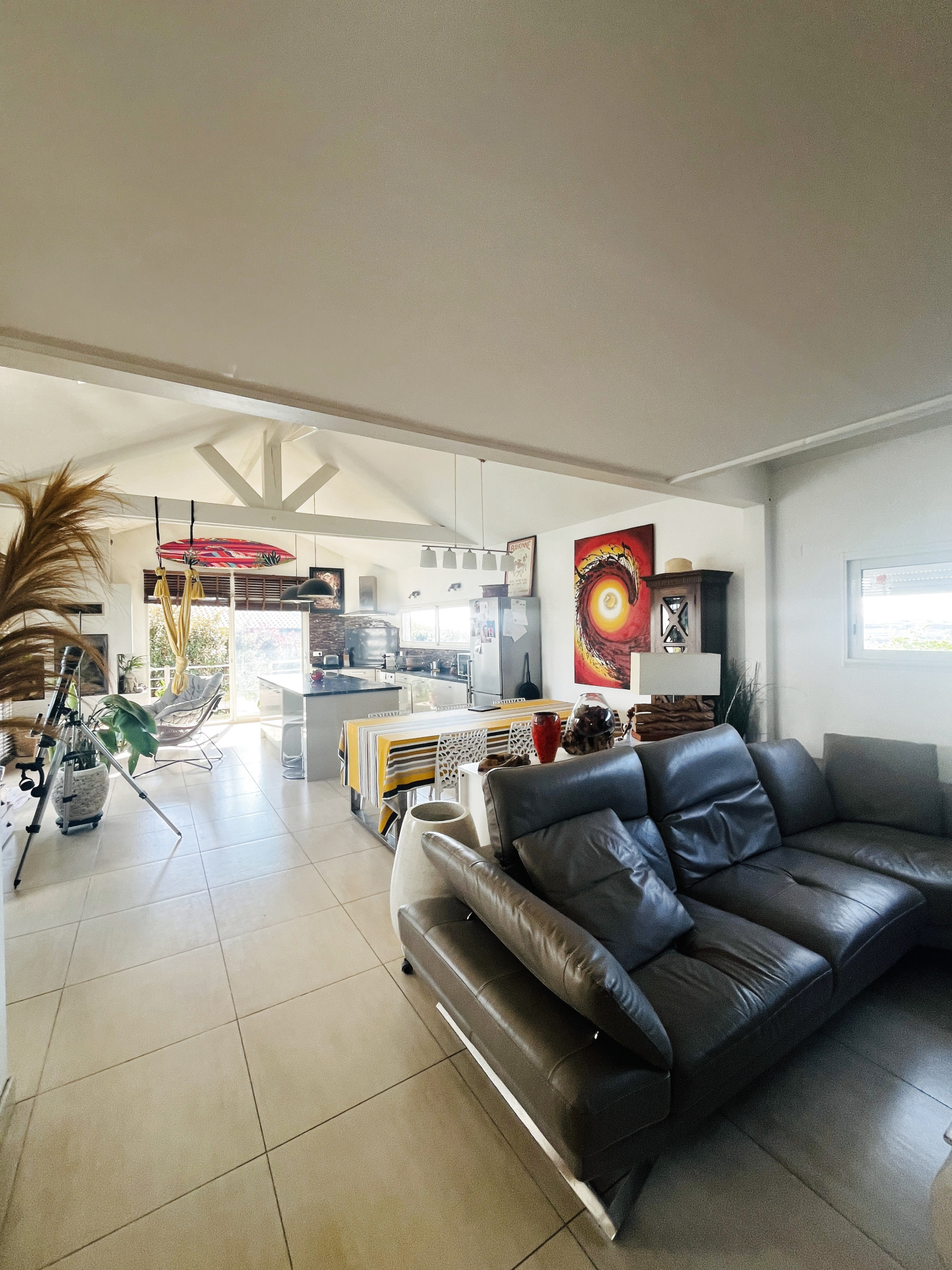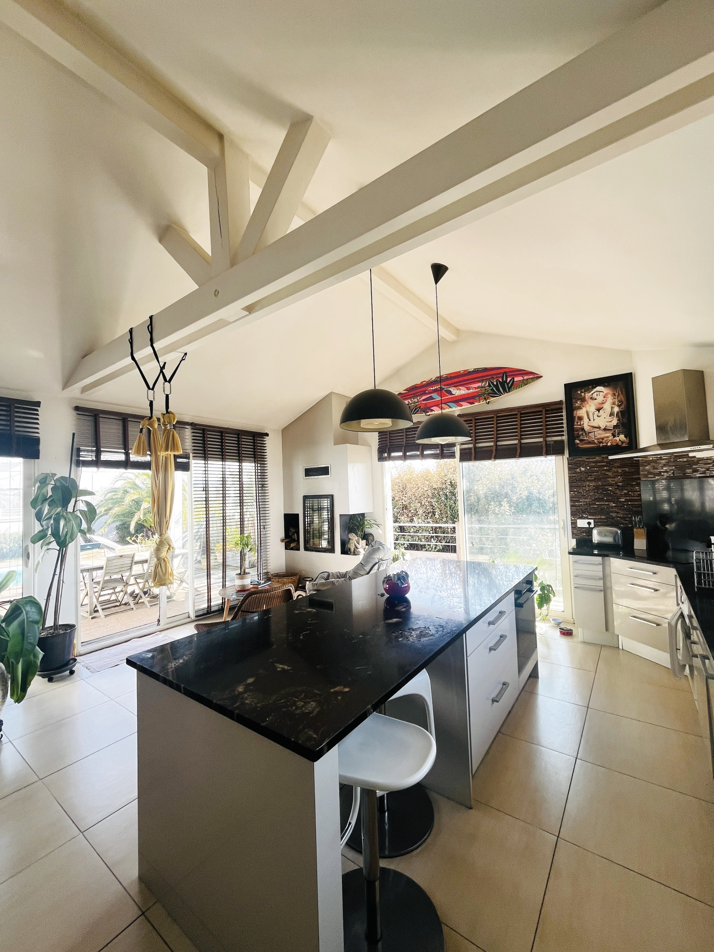 La maison principale, d'environ 122 m2, s'organise autour d'une superbe pièce de vie de plus de 62 m2, baignée de lumière grâce à son exposition plein sud et largement ouverte sur l'extérieur et le panorama. La cuisine américaine, entièrement équipée, prolonge harmonieusement cet espace convivial et résolument moderne.