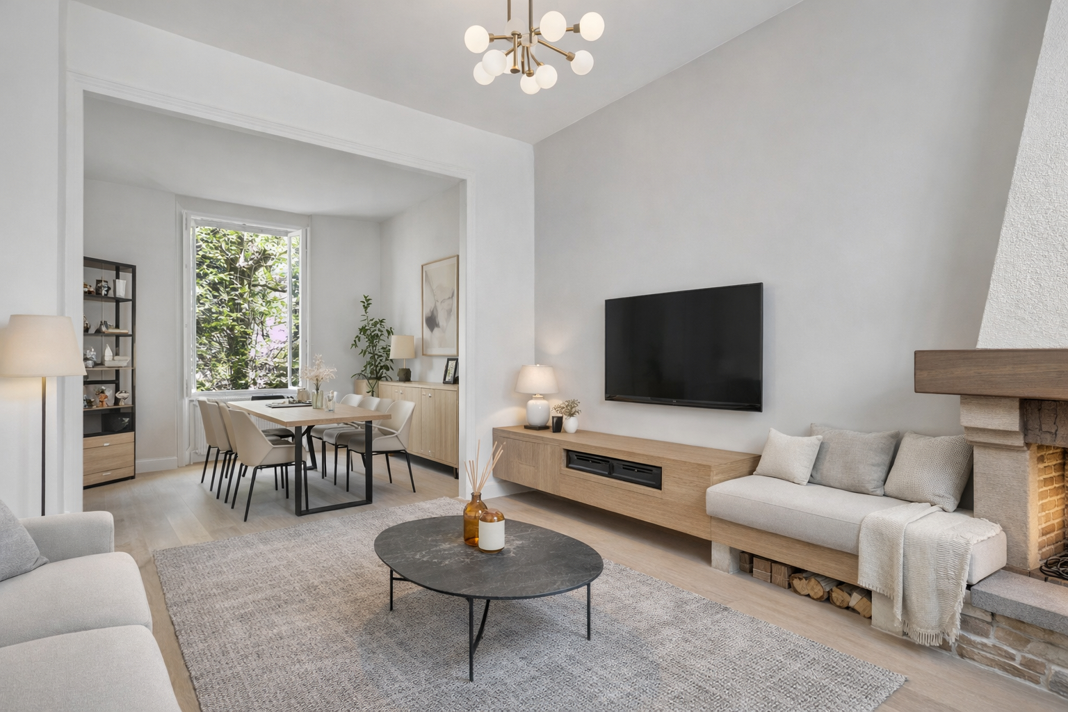 Dès l'entrée, les volumes s'expriment. Le rez-de-chaussée accueille une cuisine et une belle double pièce de vie salon/salle à manger.