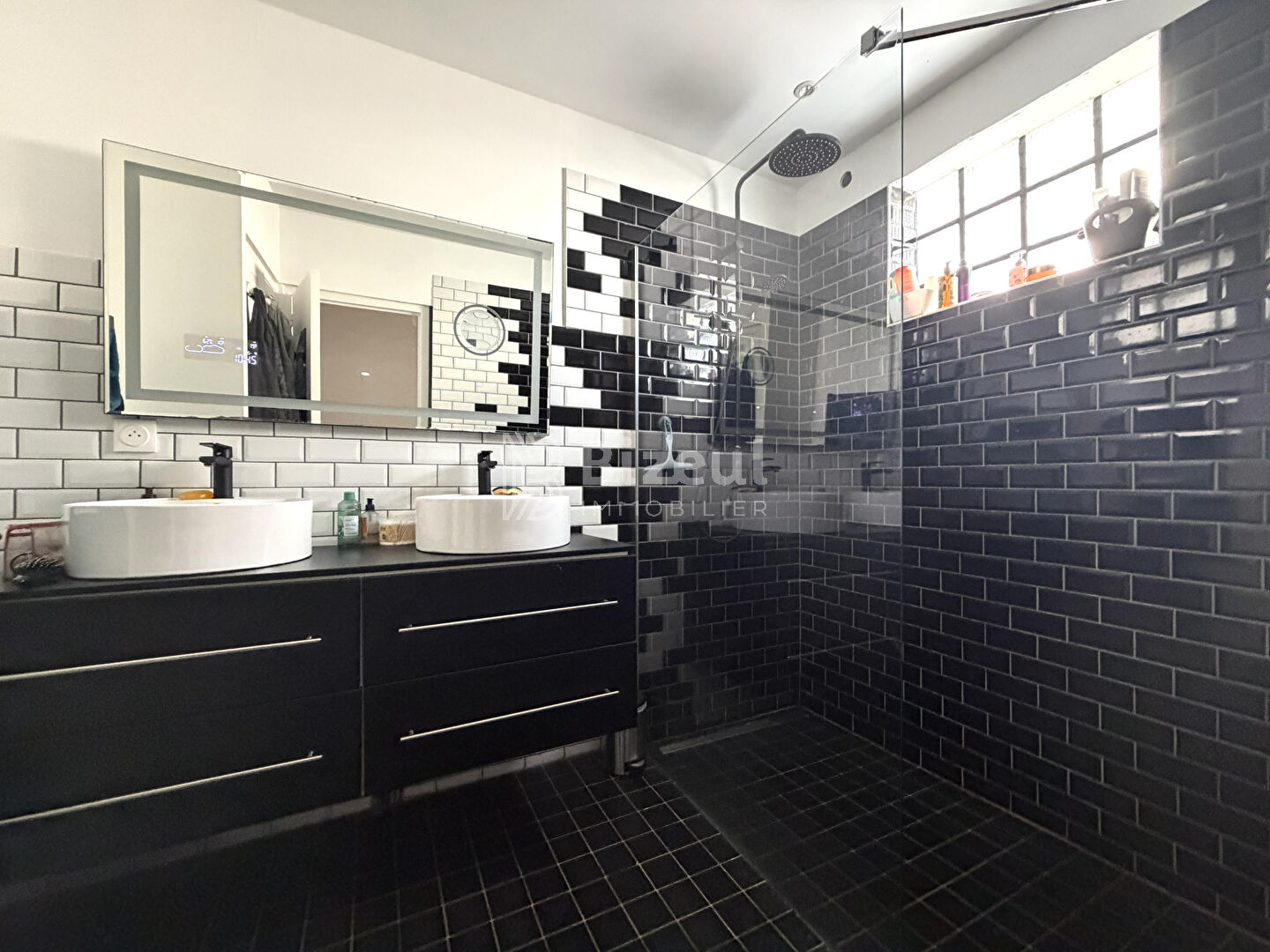 Elle se compose au rez-de-chaussée d'une vaste entrée, d'une belle cuisine aménagée et équipée, ainsi qu'un salon-séjour traversant est-ouest de plus de 41 m².