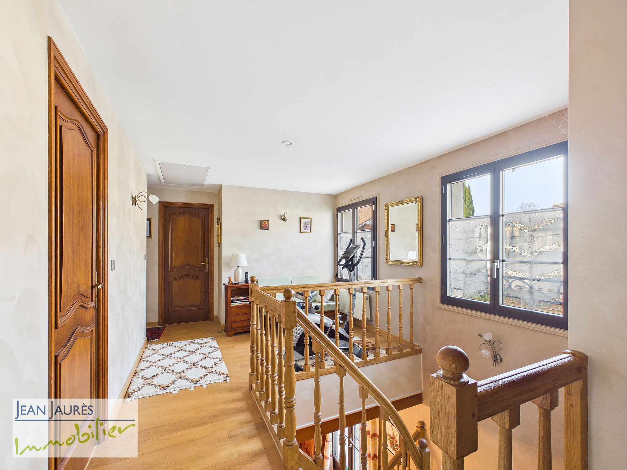 Le 1er étage, tout en couleur douce et à l'harmonie de parquets de qualité propose 3 chambres et une salle de bains (baignoire balnéo et belle douche).