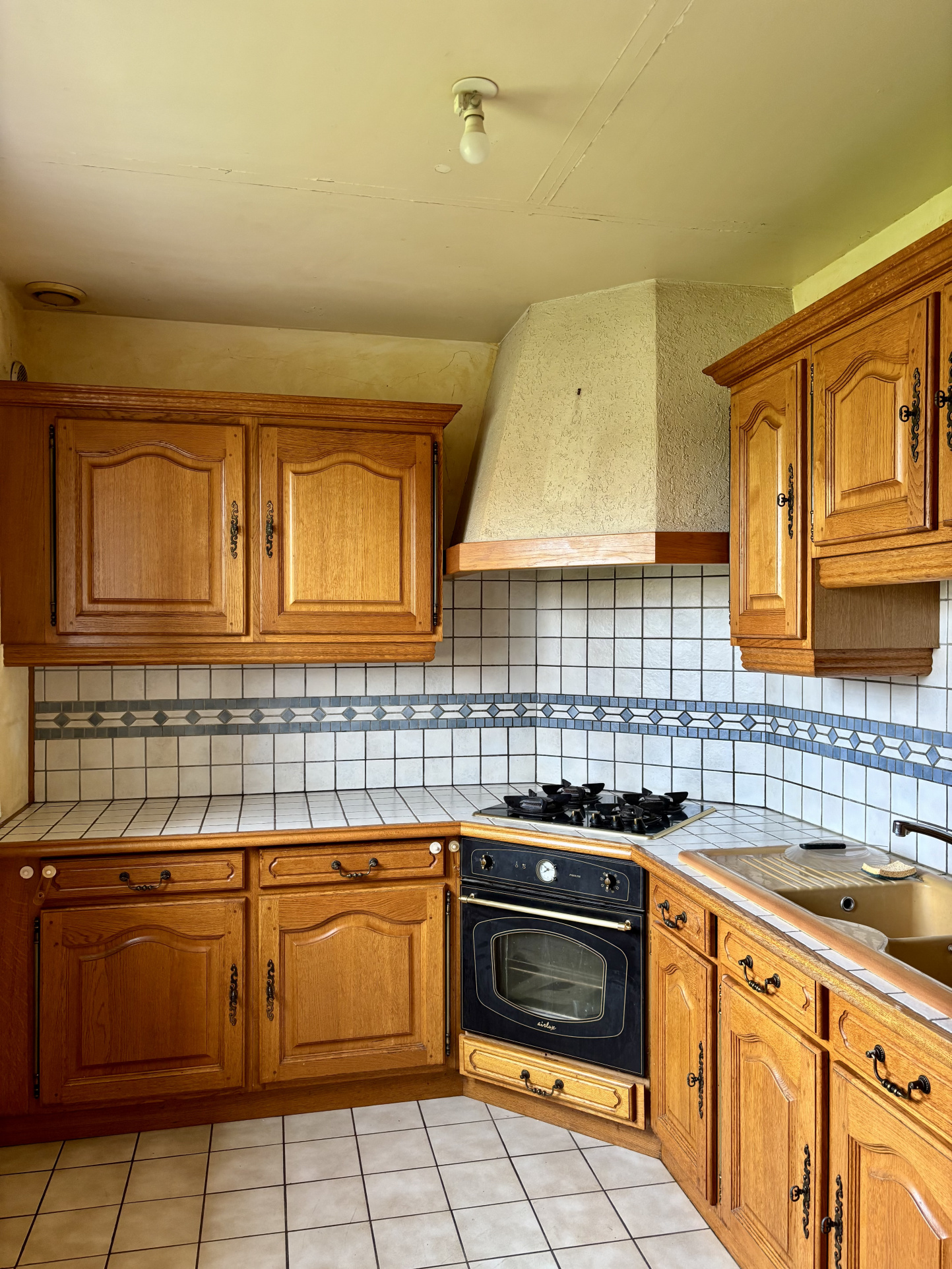 La cuisine, spacieuse et parfaitement équipée, offre un aménagement moderne et fonctionnel. Une chambre confortable, une salle de bains et des WC complètent le rez-de-chaussée.