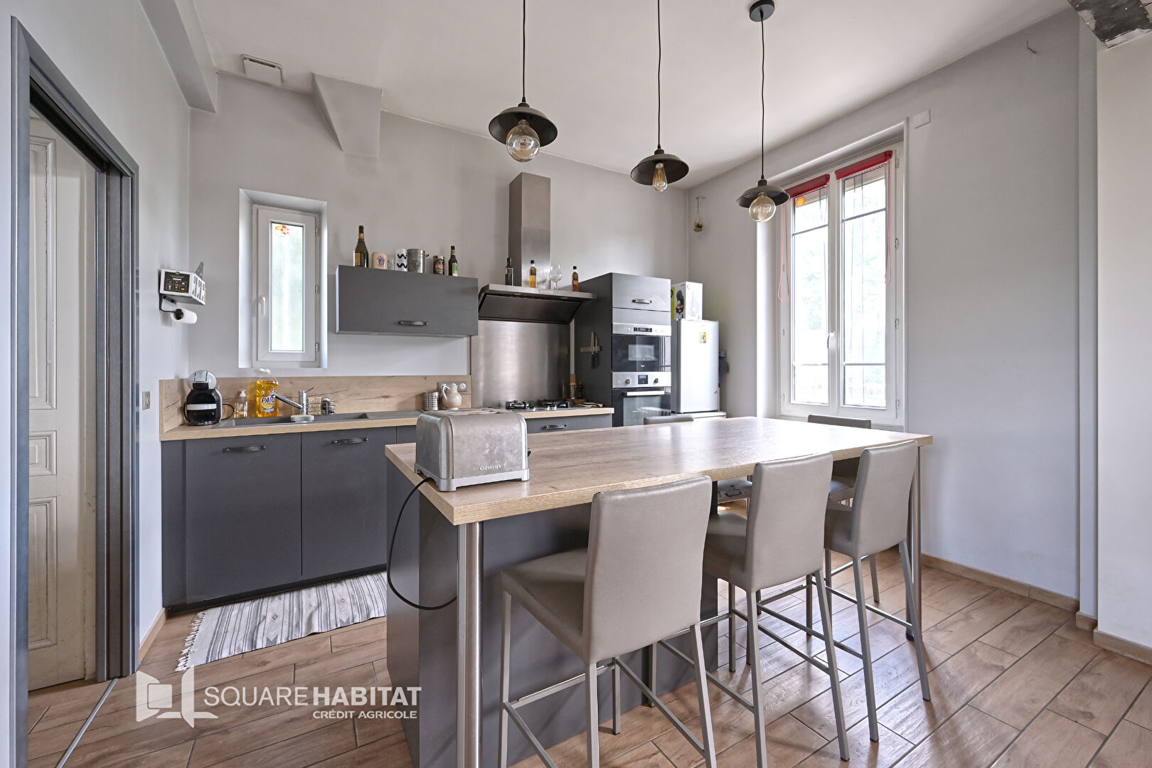 Grande pièce de vie lumineuse avec poêle à bois, cuisine équipée donnant sur terrasse et jardin.