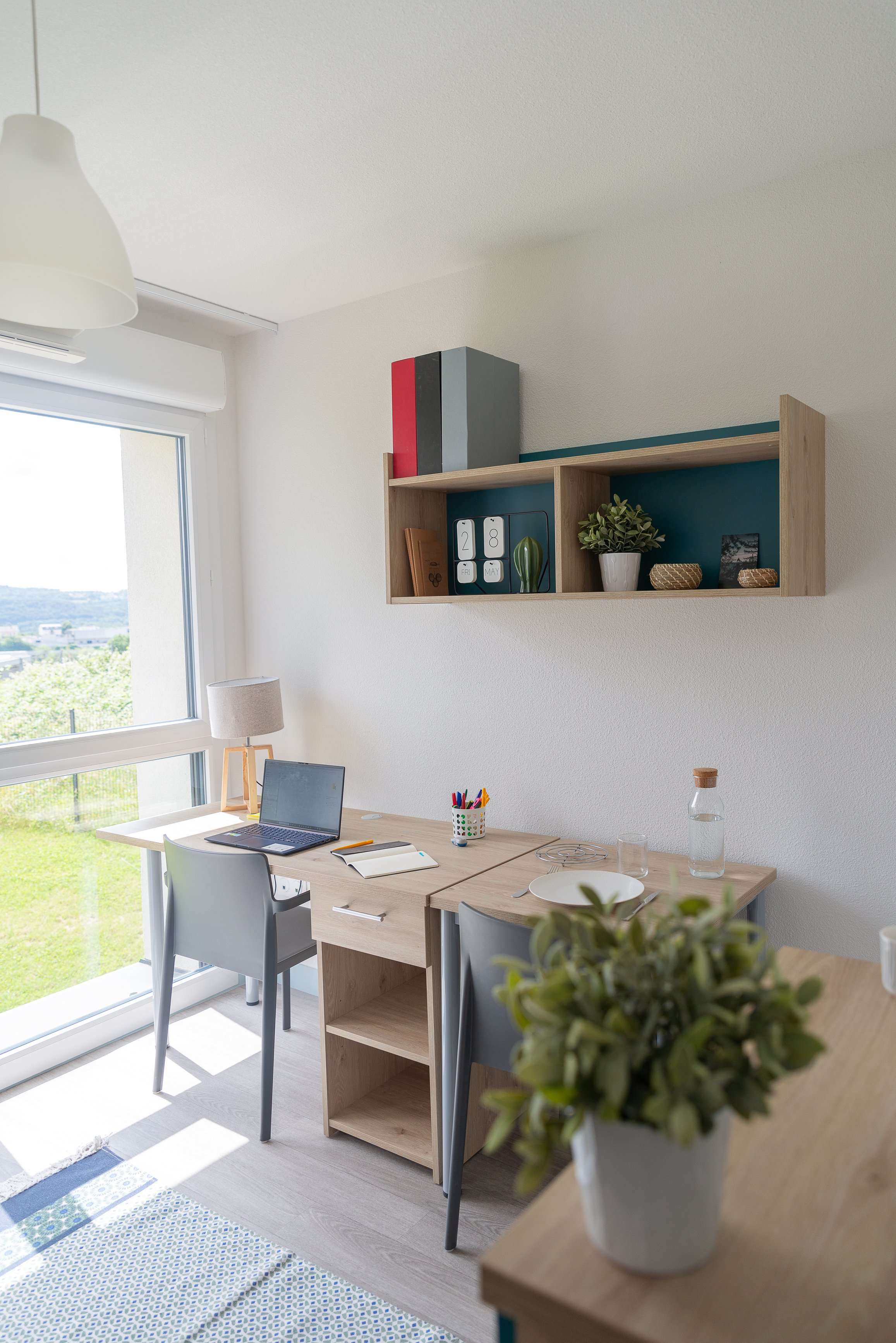 - Equipement du logement étudiant : kitchenette équipée avec plaques vitrocéramiques, réfrigérateur, four à micro-ondes, kit vaisselle ; mobilier complet ; salle d'eau avec douche et WC.