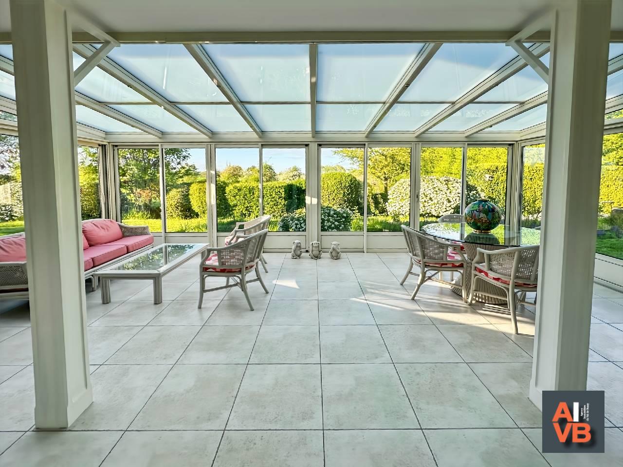 Prolongement naturel de cet espace de réception, une véranda entièrement vitrée de 30m², devient un véritable salon sur le jardin, offrant une vue dégagée et apaisante sur le golf, dans une parfaite continuité entre intérieur et extérieur.