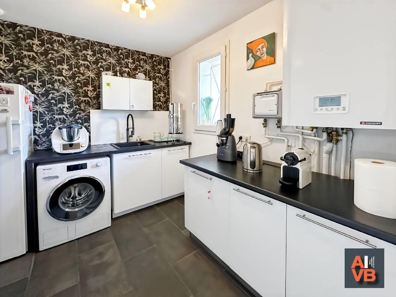 La cuisine contemporaine, entièrement aménagée et équipée, séduit par son design épuré, s'articule autour de son îlot central et de son espace repas convivial, avec un accès direct à la terrasse. Elle est complétée par une arrière-cuisine discrète et un cellier.