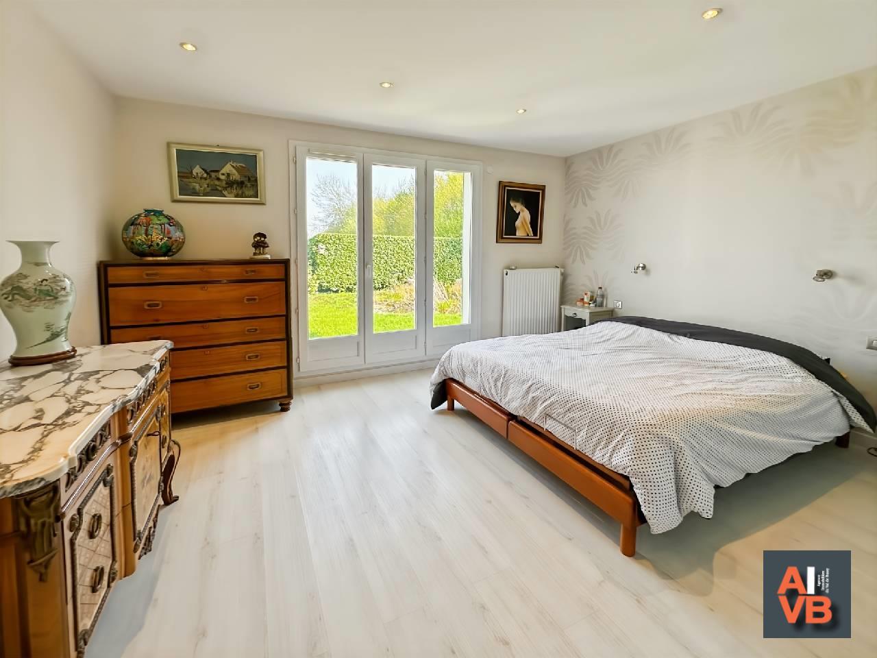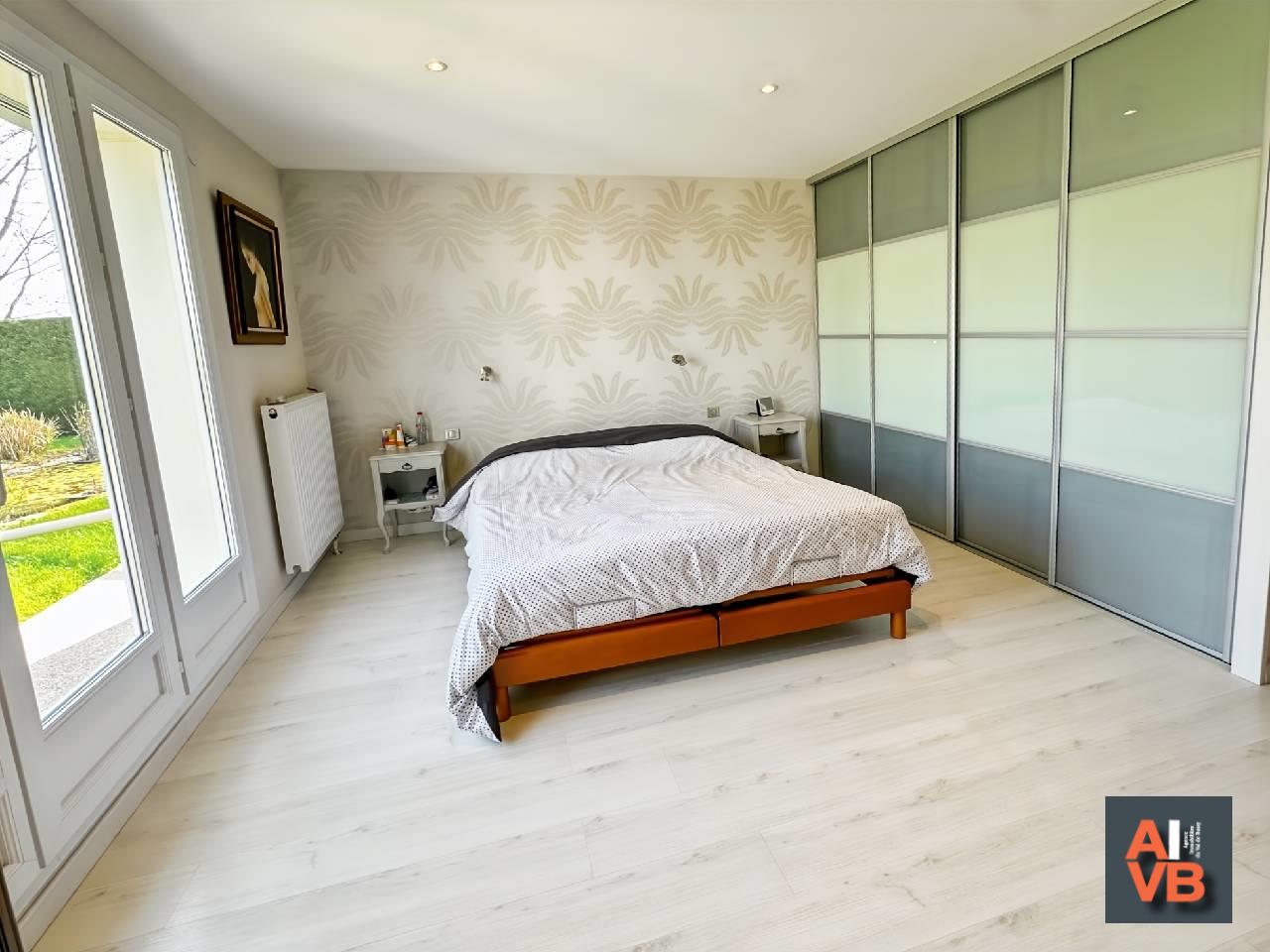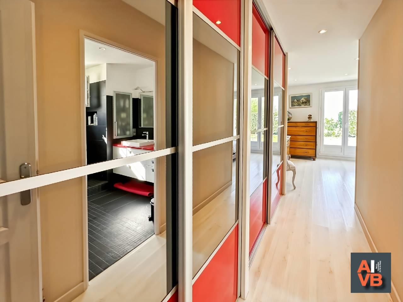 L'Aile droite : une élégante suite parentale de 25 m² avec rangements et salle d?eau moderne, ainsi que deux chambres lumineuses ouvertes sur le jardin et une salle de bains indépendante.