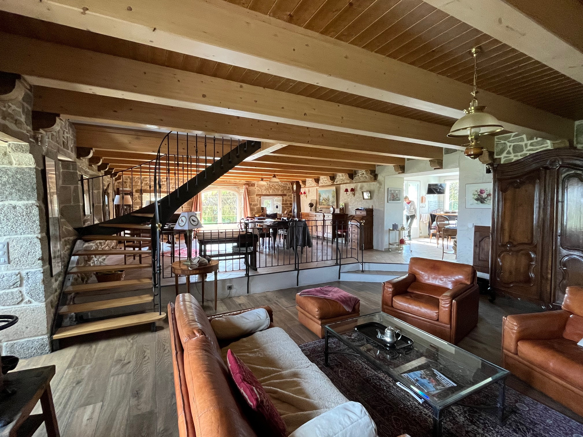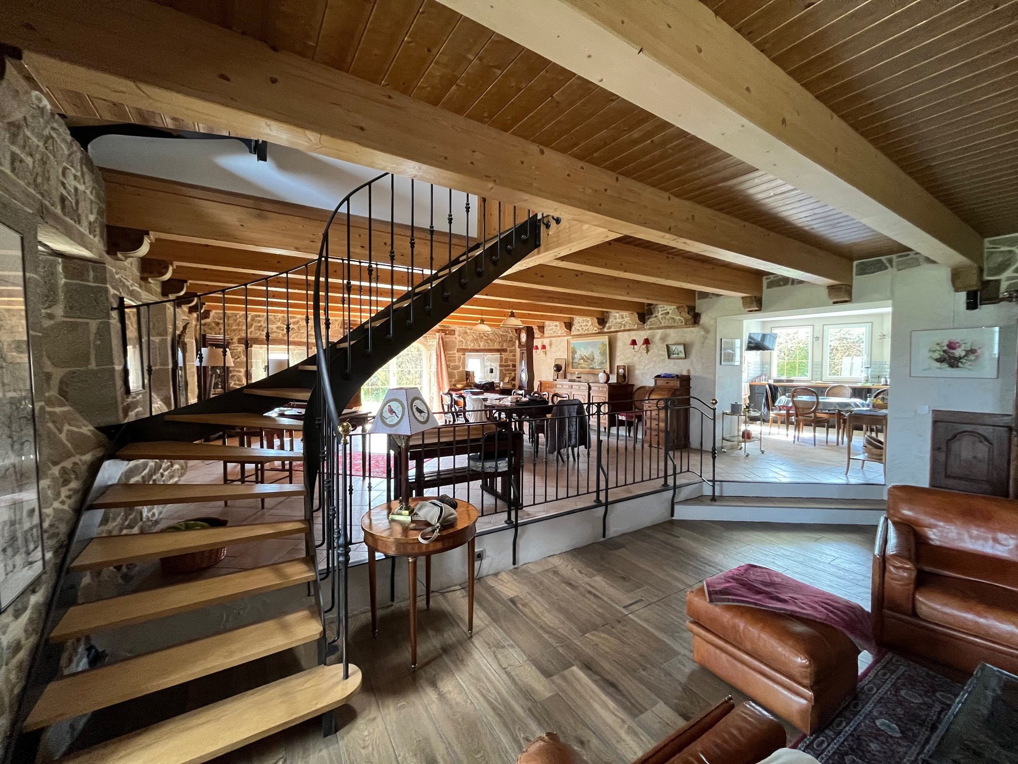 o Superbe pièce de vie de près de 80 m2, offrant un salon et une salle à manger qui s'articulent autour d'un trés bel escalier alliant métal et bois. Un poêle à bois complète harmonieusement ce lieu de vie.