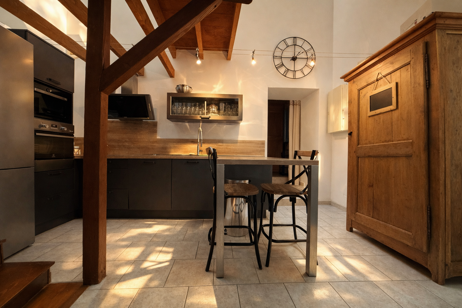 Le volume habitable vous accueille en Rez-De-Chaussée par une vaste pièce de vie ouverte sur une cuisine meublée et semi-équipée, ornée d'un plafonds cathédrale avec velux pour une luminosité optimale.