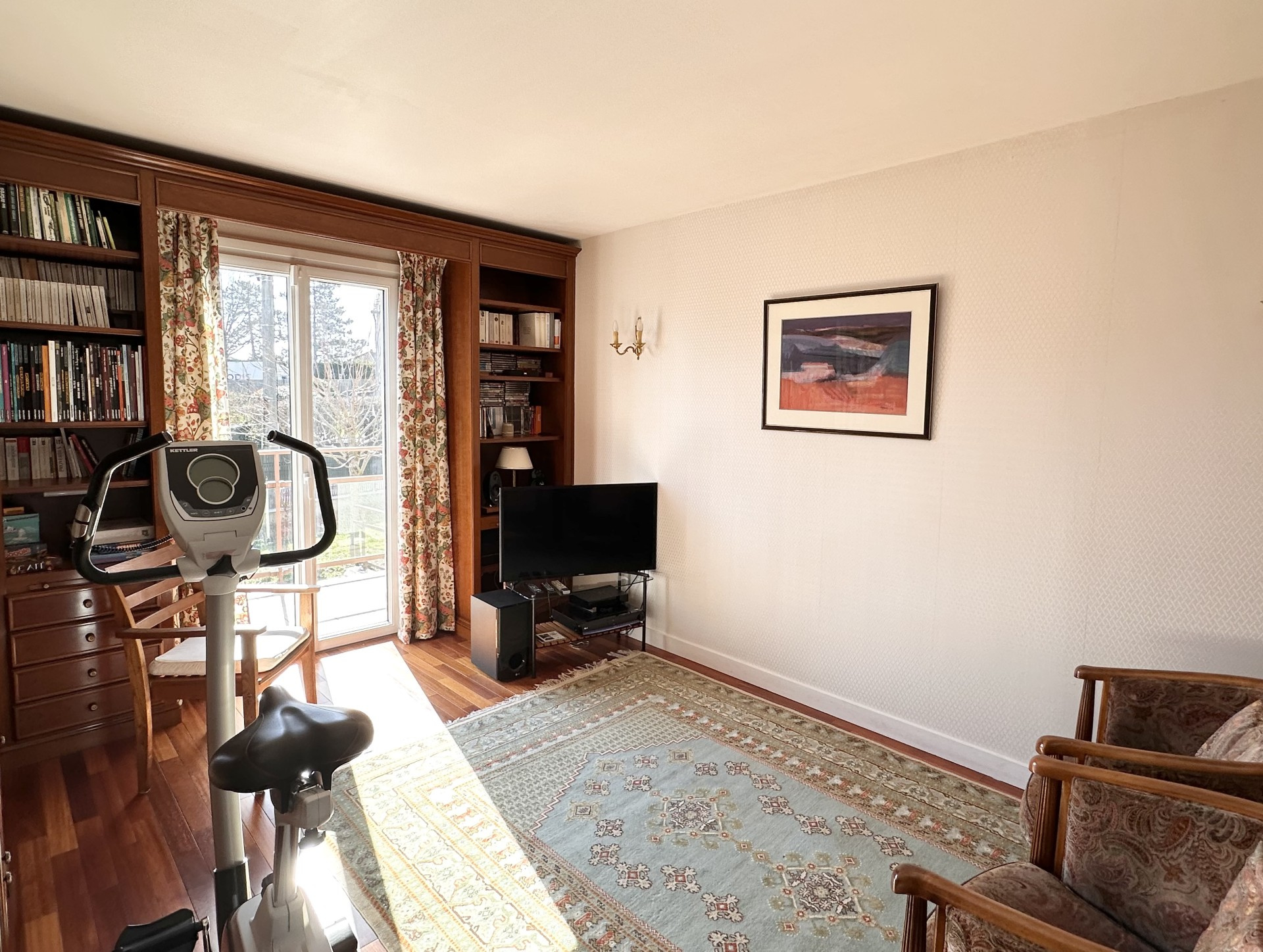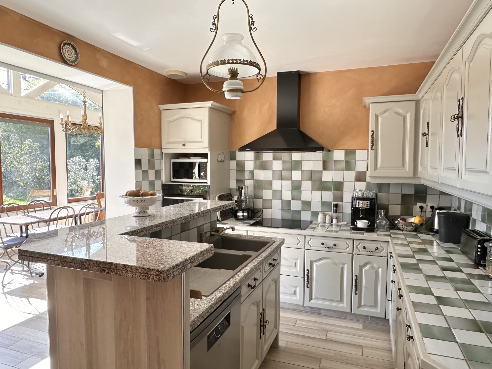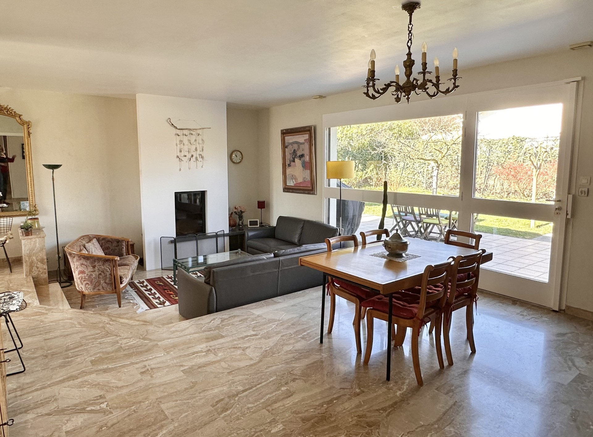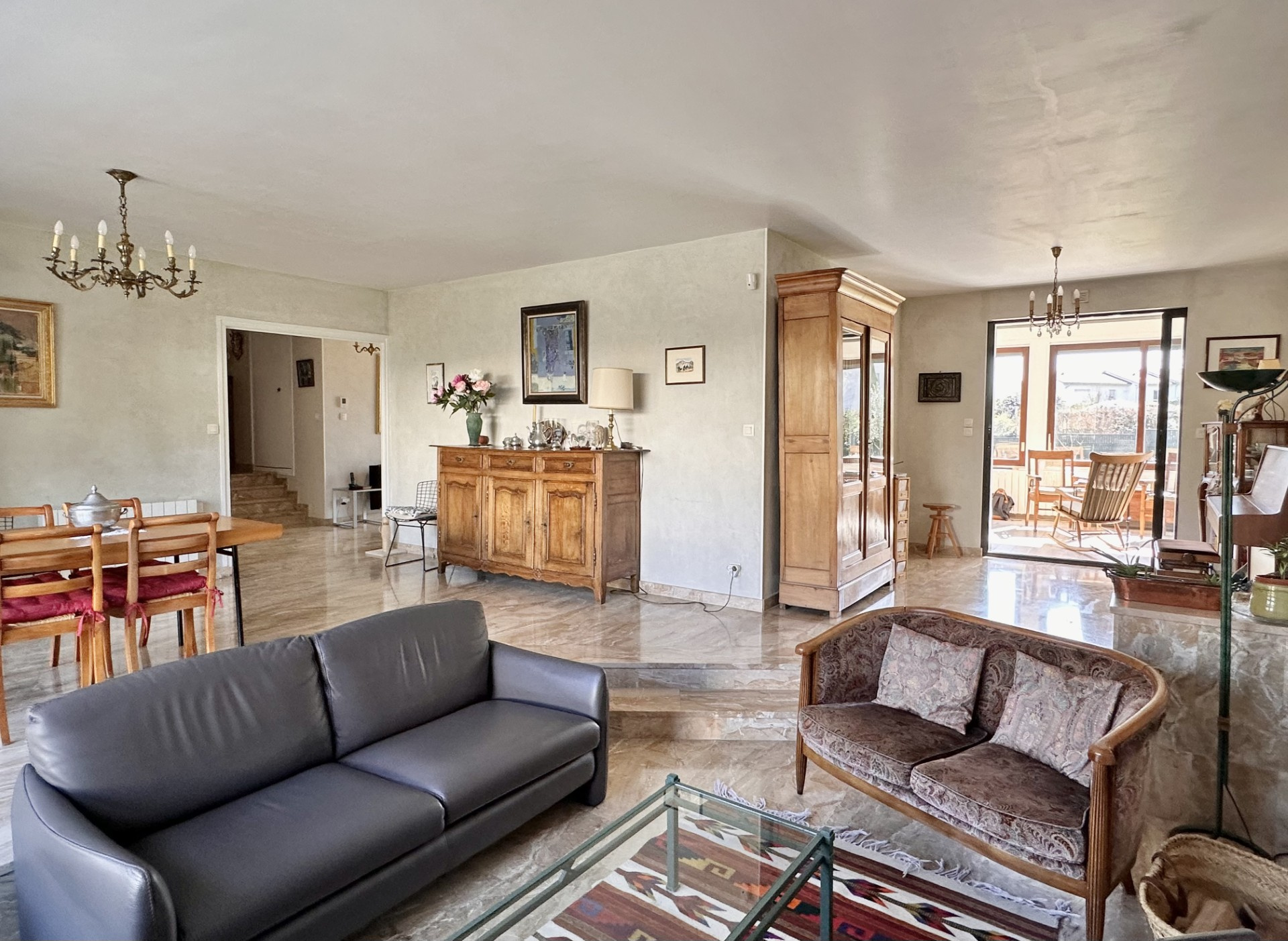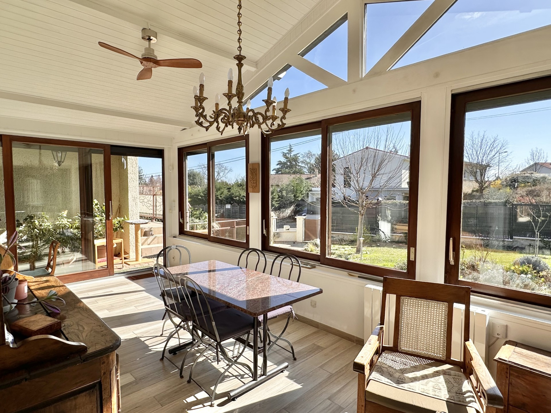 Elle se compose d'un hall d'accueil, d'un bel espace à vivre de 44 m2 avec sa cheminée à insert, d'une cuisine entièrement équipée et ouverte sur la véranda baignée de lumière et donnant accès au jardin.