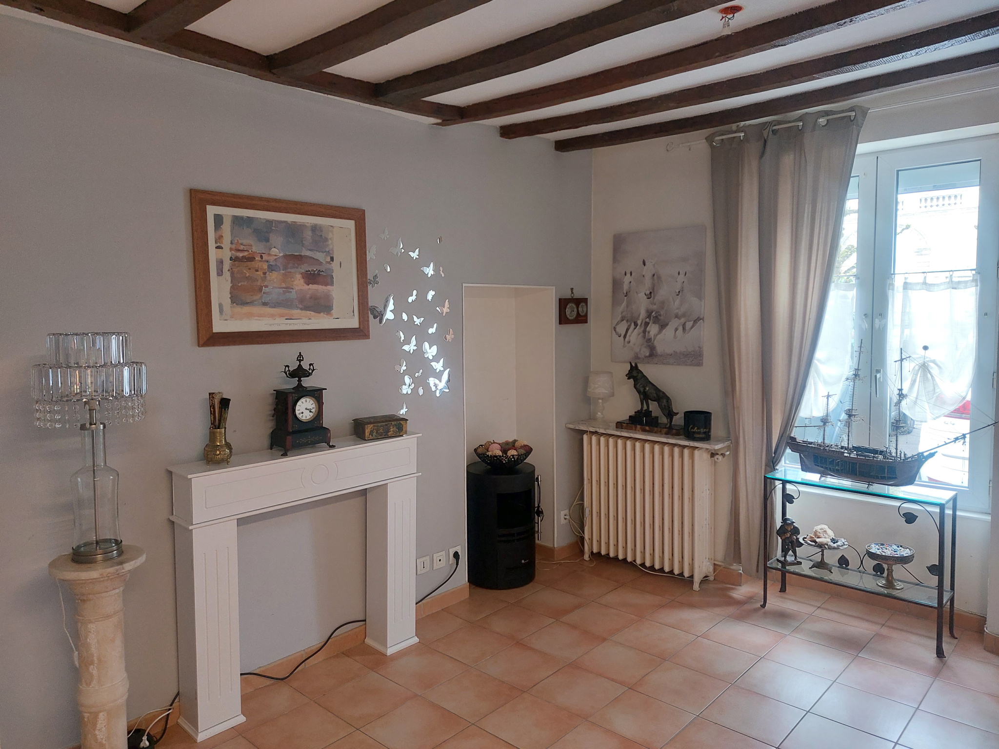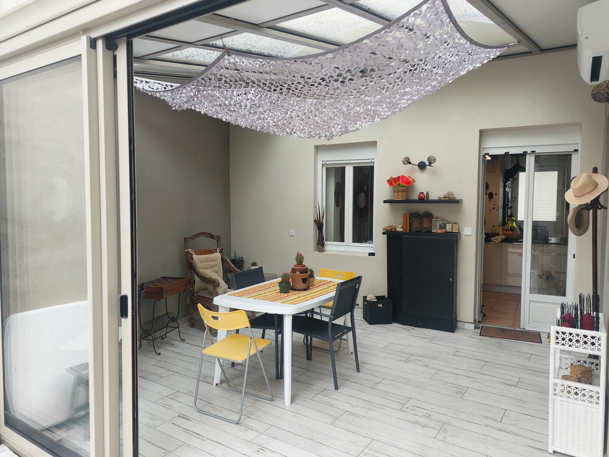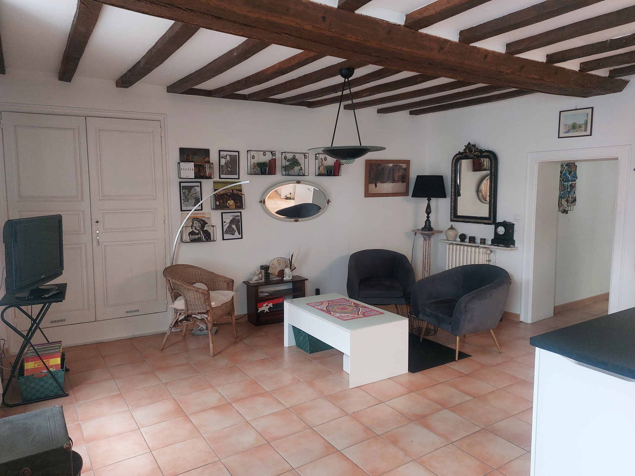 Au coeur du centre-ville de La Flèche, maison de ville comprenant : entrée sur pièce de vie avec salon, séjour et cuisine A/E donnant sur véranda, bureau, WC avec lave-mains.