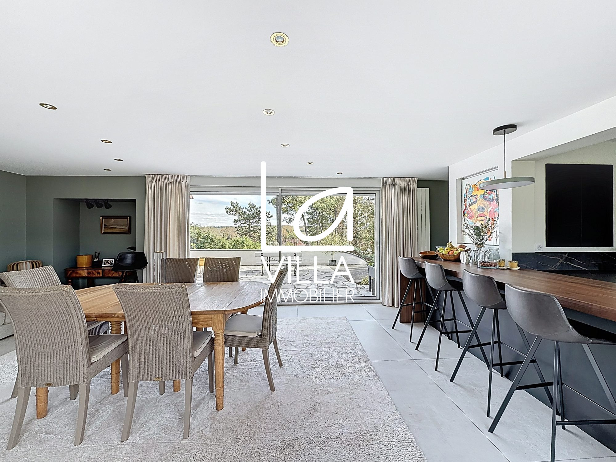 Le **salon de 40m²**, avec son coin cheminée, est un véritable havre de paix où vous pourrez vous ressourcer auprès de vos proches ou recevoir vos invités dans une ambiance chaleureuse et sophistiquée. La **cuisine aménagée et équipée** en coin cuisine, alliant praticité et design, est l'endroit idéal pour préparer des repas gourmands tout en profitant de la vue imprenable sur le jardin.