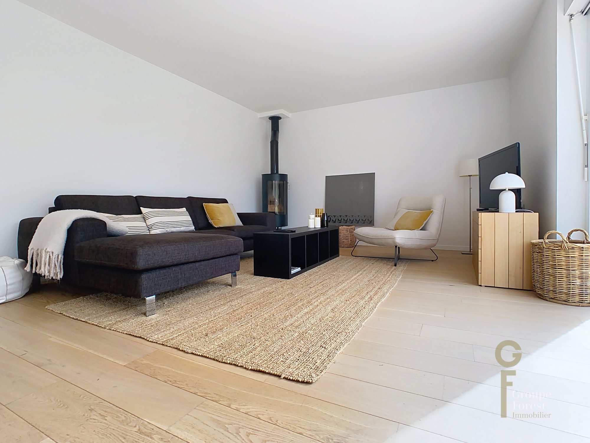 - Hall d'entrée donnant sur un grand séjour parqueté de 40 m2 avec poêle à bois, baigné de lumière