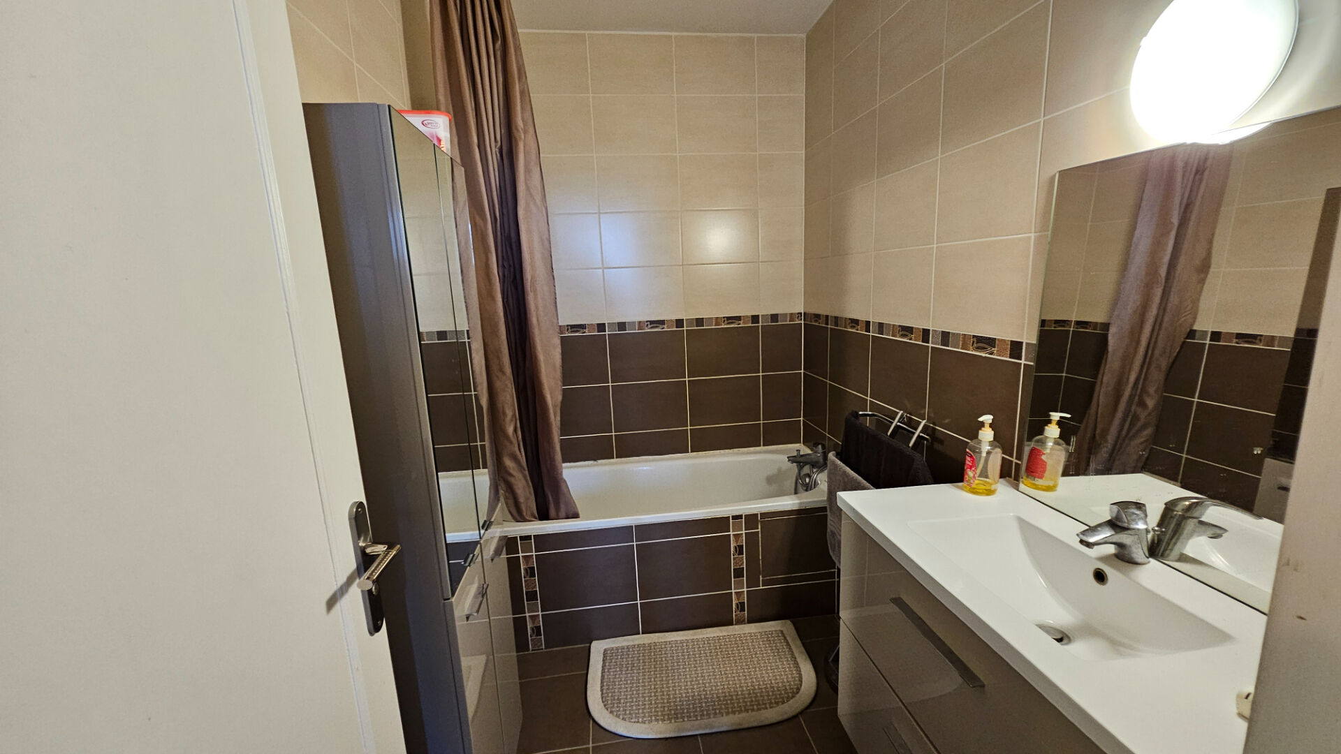 - Une salle de bain entièrement rénovée avec carrelage contemporain et baignoire