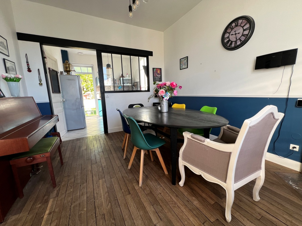 Au rez-de-chaussée, l'entrée dessert une salle à manger avec sa verrière atelier donnant sur la cuisine aménagée et équipée, un salon lumineux, une chambre, ainsi qu'une salle de bain et un WC séparés.