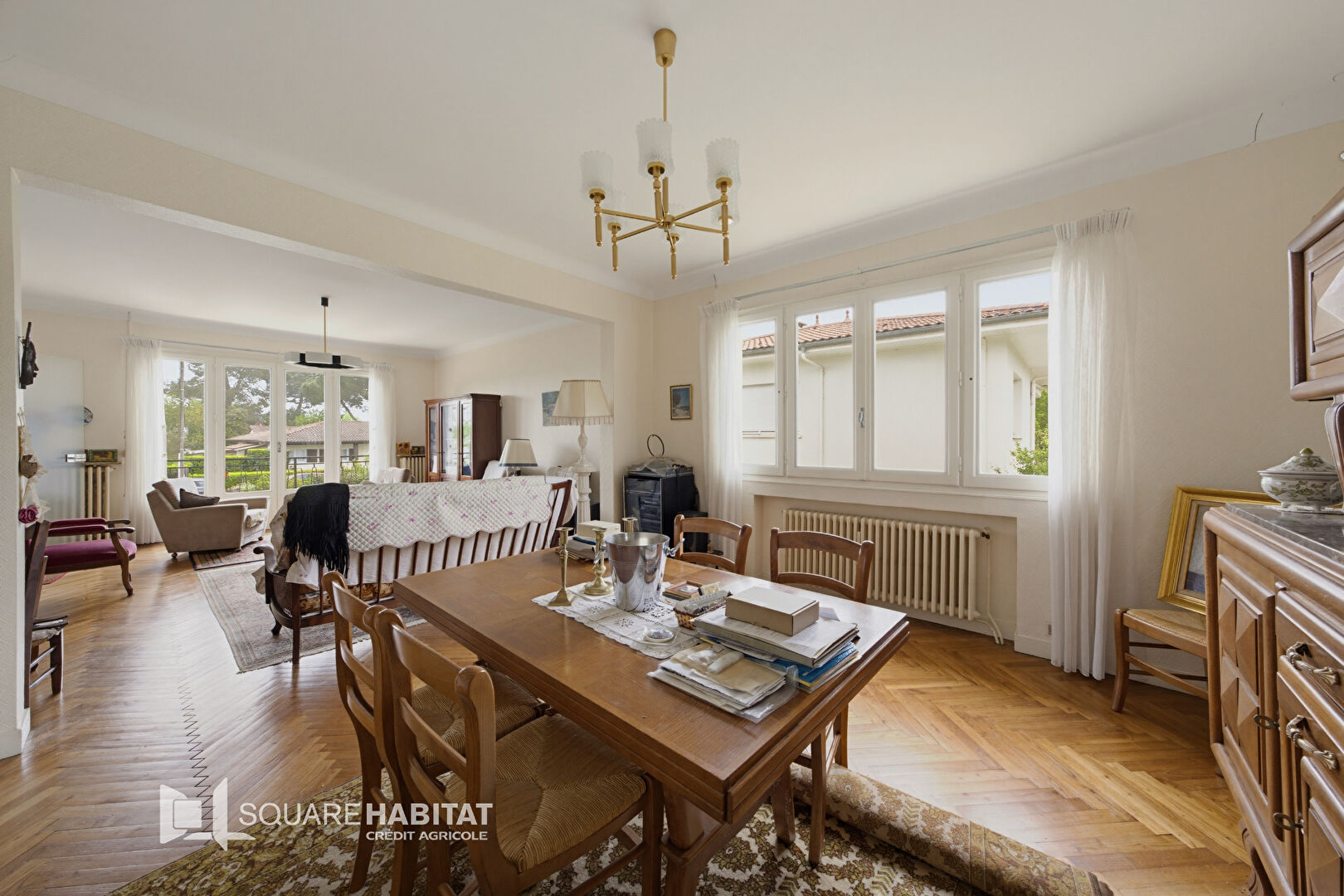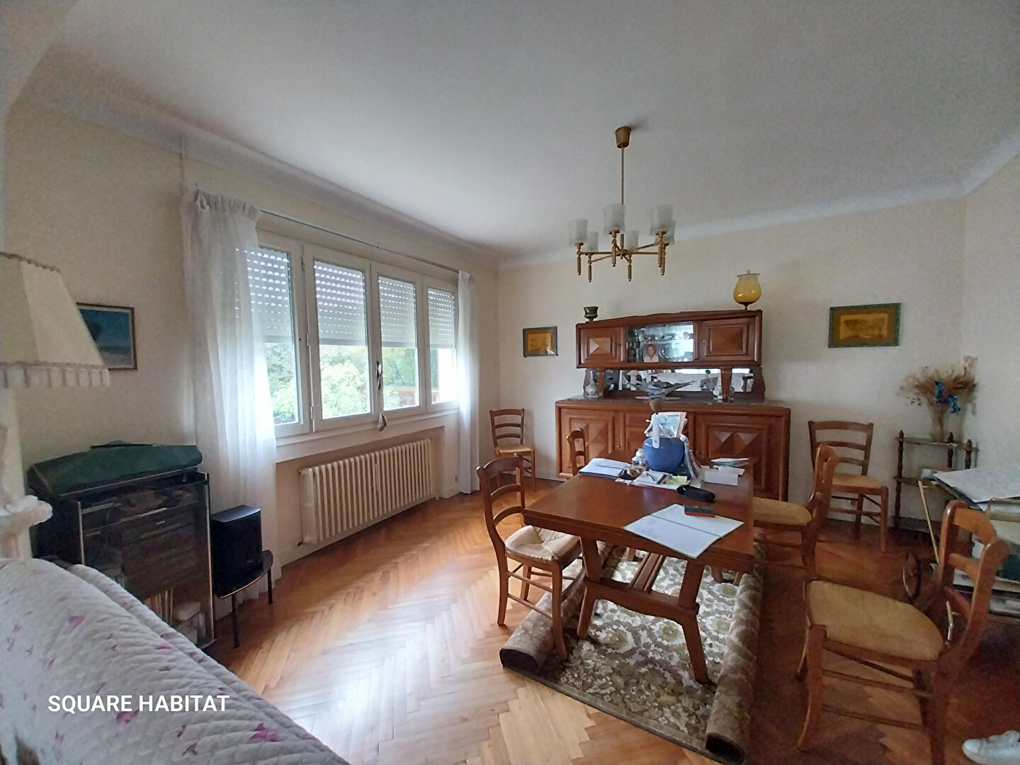 Dès l'entrée, on est séduit par un séjour spacieux aux parquets à bâtons rompus, typiques des années 70, qui apporte une touche d'authenticité. Ce séjour s'ouvre sur une salle à manger de belle dimension, idéale pour les repas en famille ou entre amis.