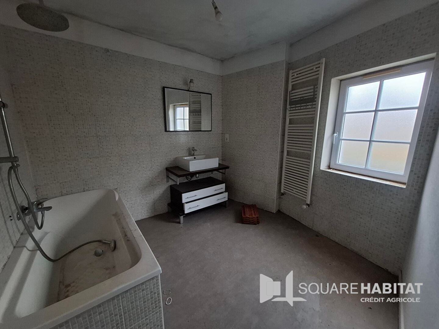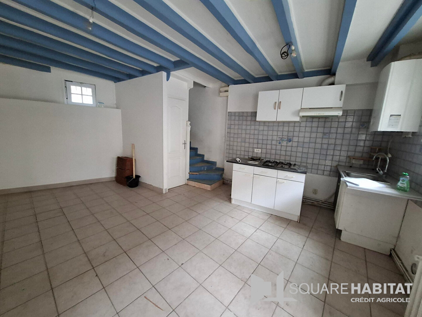 Elle se compose d'une pièce de vie avec cuisine, un toilette indépendant, à l'étage se trouve une chambre et une salle de bains avec fenêtre et le dernière étage est une pièce brut à finir.