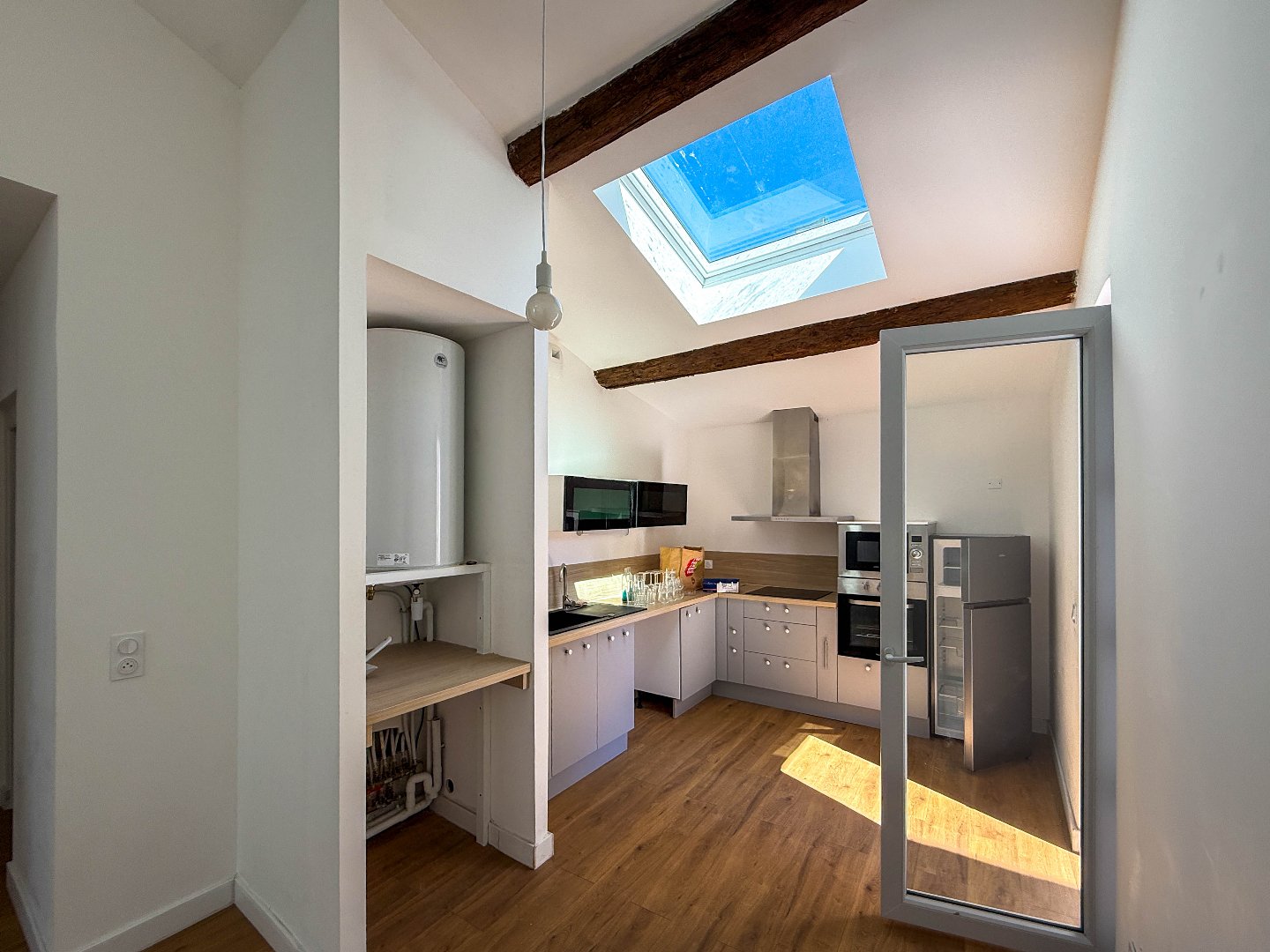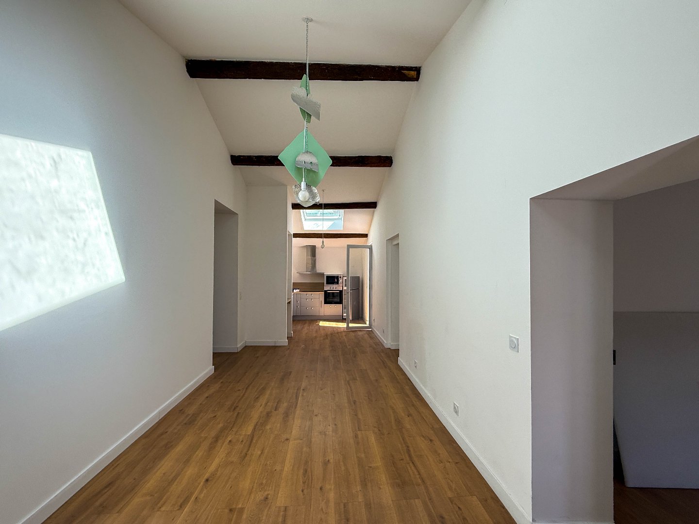 L'appartement surprend par sa lumière, les pièces de vie sont traversantes, la cuisine ouverte sur la salle à manger et le salon donne sur un balcon plein sud, les deux chambres sont aux opposées, salle d'eau et WC indépendant.