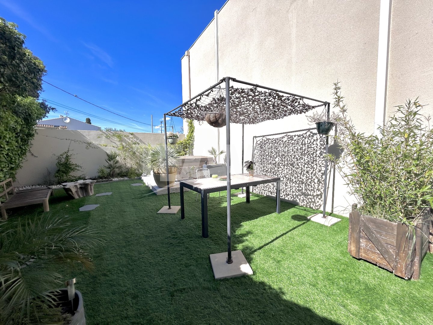 Rez-de-jardin : Cuisine ouverte sur séjour 37 m² prolongé par une terrasse bois et un jardin paysagé sans vis-à-vis, jacuzzi 3 personnes. Buanderie, cellier.