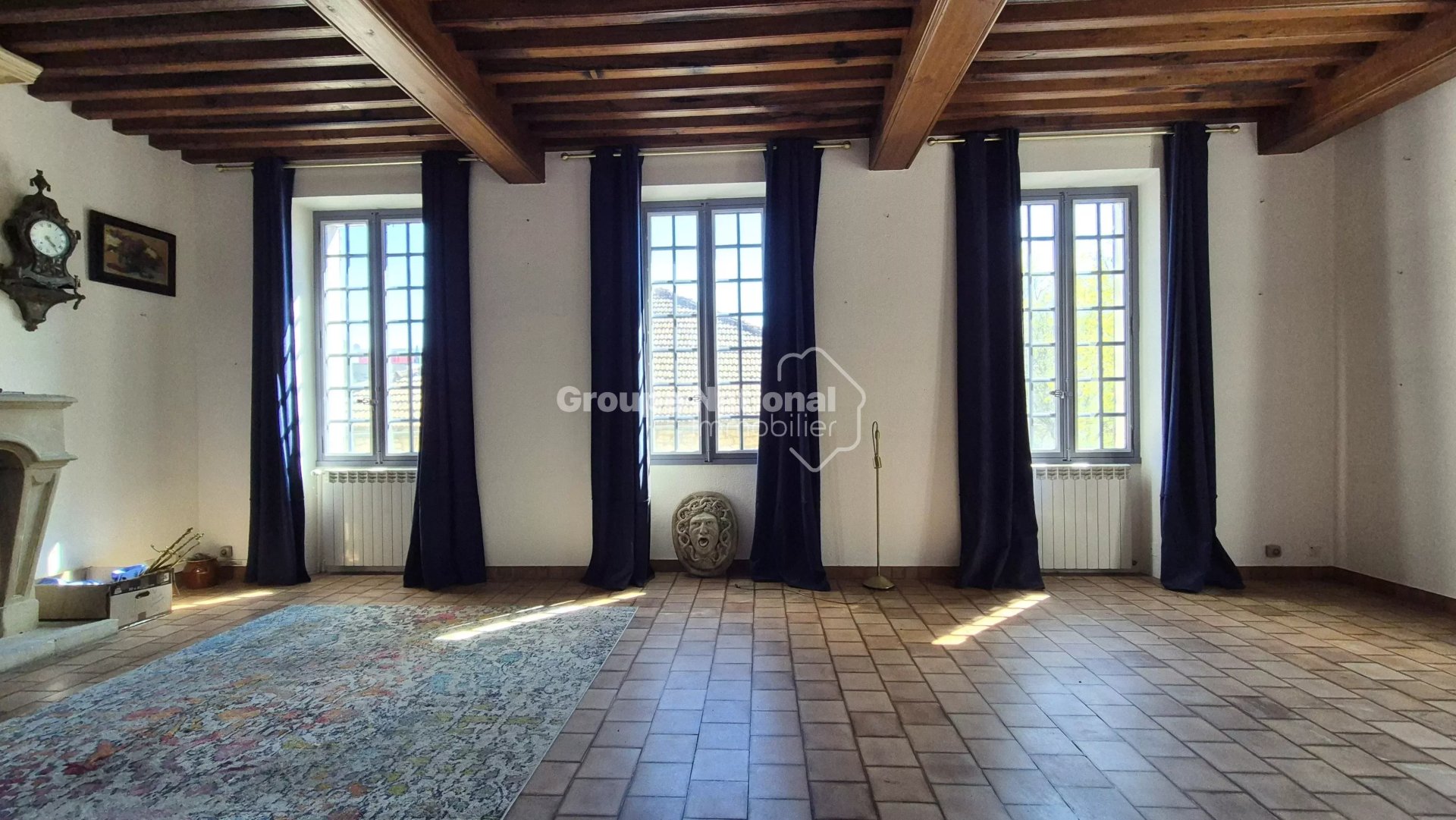 La vaste pièce de vie lumineuse, agrémentée d'une belle cheminée en pierre, d'un plafond à la Française, invite à la détente dans une ambiance chaleureuse.