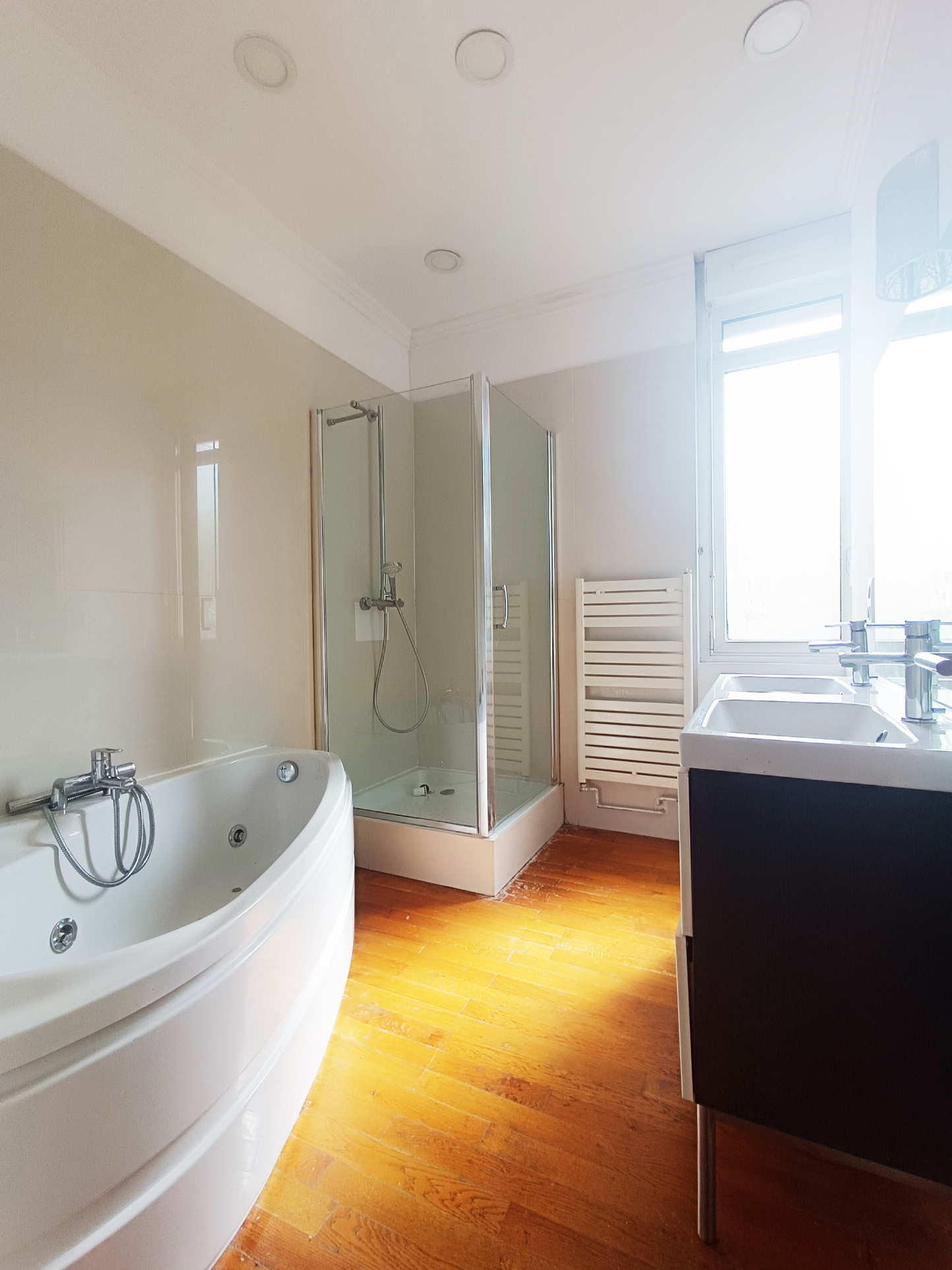 L'appartement dispose de deux chambres, chacune équipée de placards muraux. La salle de bain propose à la fois une baignoire balnéo et une douche. Un WC séparé ainsi qu'une buanderie avec placards muraux et emplacement pour machine à laver complètent l'ensemble. De nombreux autres espaces de rangement rendent le bien particulièrement fonctionnel. Une cave offre également un espace de stockage appréciable.